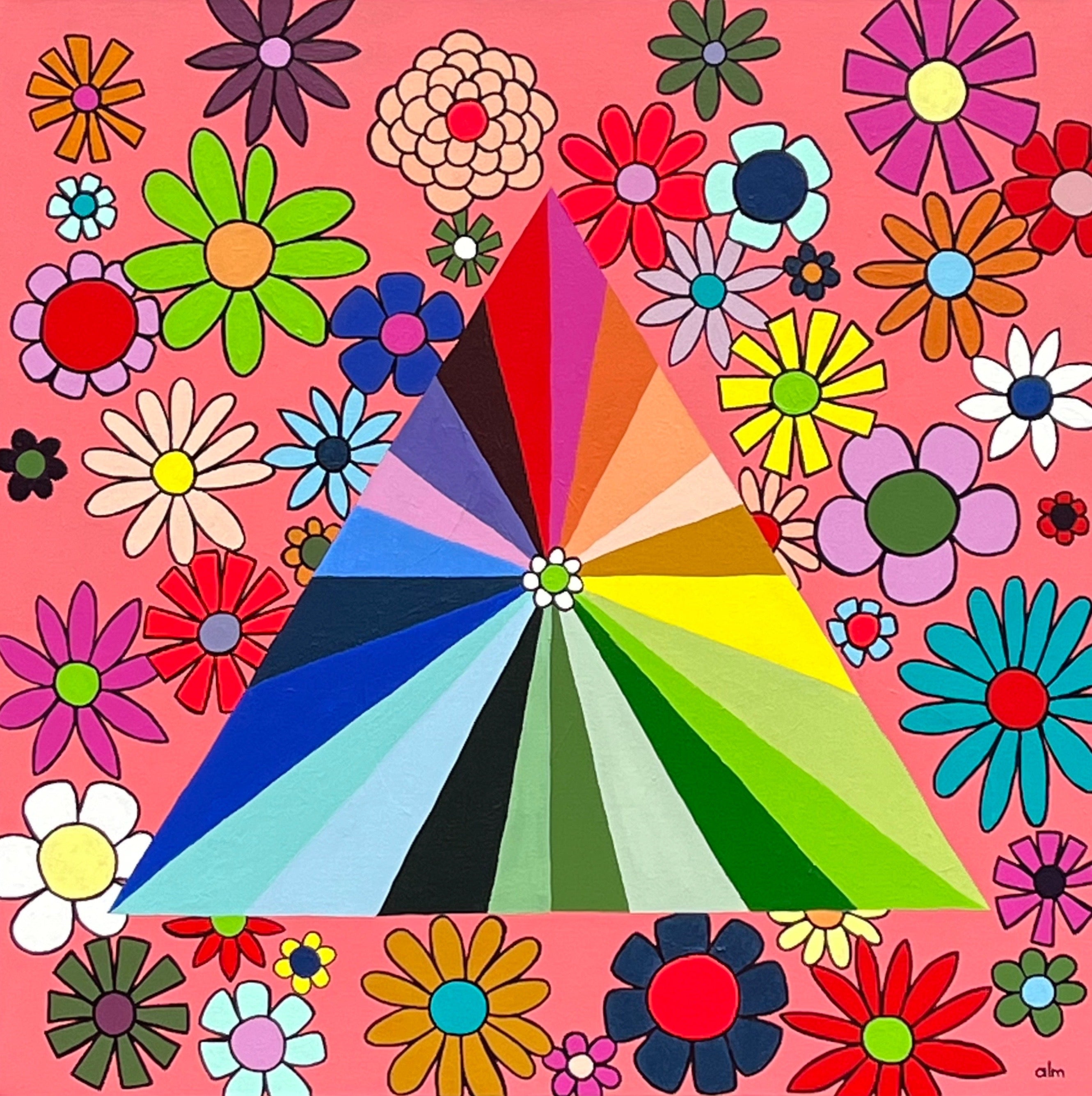 This is a combination of many things I am currently, and potentially forever, loving! Flowers and rainbows in particular. I am having a bit of an awakening this year. Spiritually, creatively, and financially. Thus the triangle. Painted in 2024.