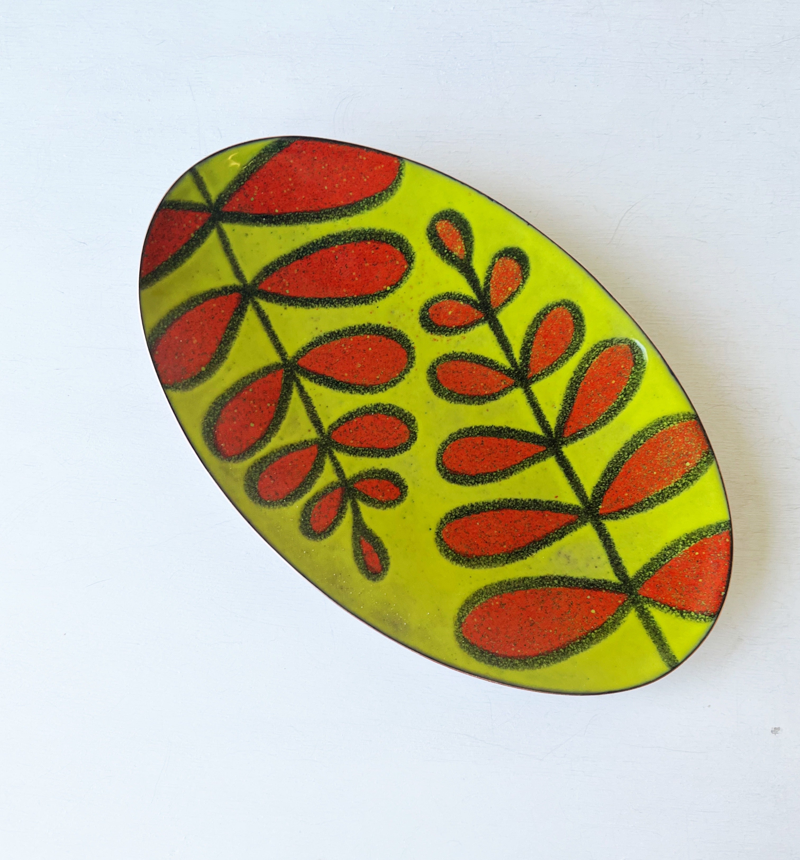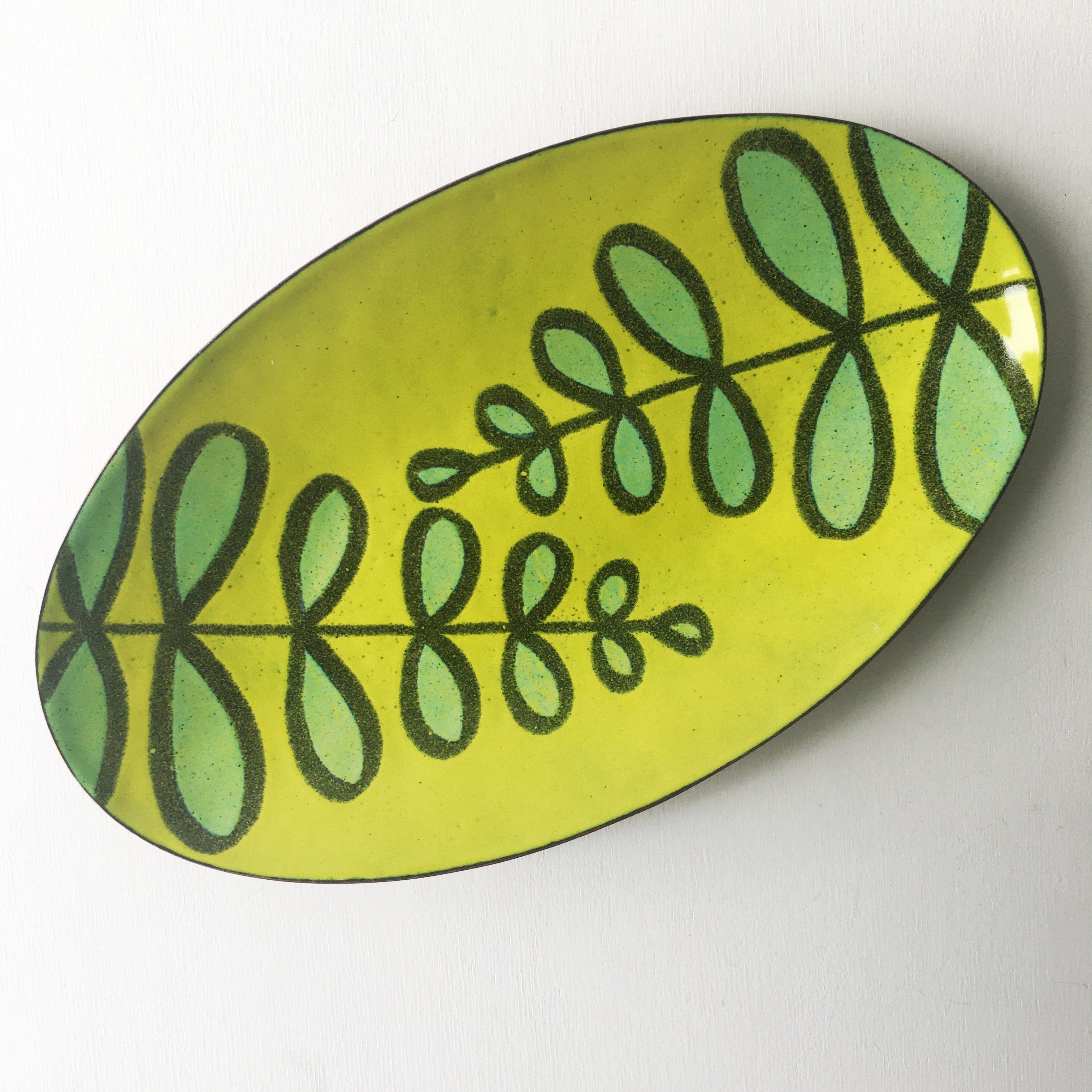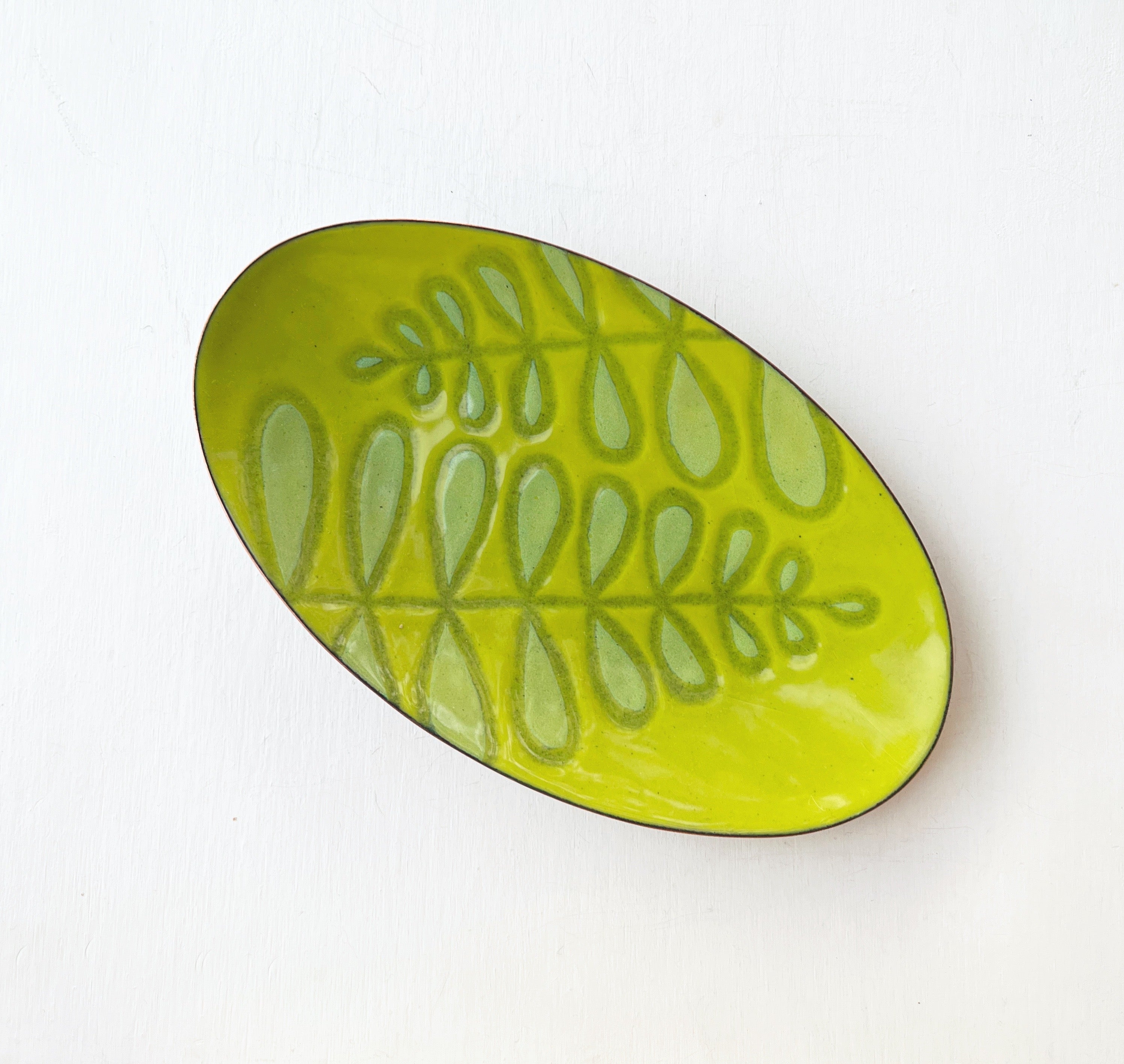 Kiln fired glass enamel on a stamped copper dish. I draw each one by hand, fire it four times, and sign and date the bottom. 4 1/2" x 7 1/2" x 3/4"