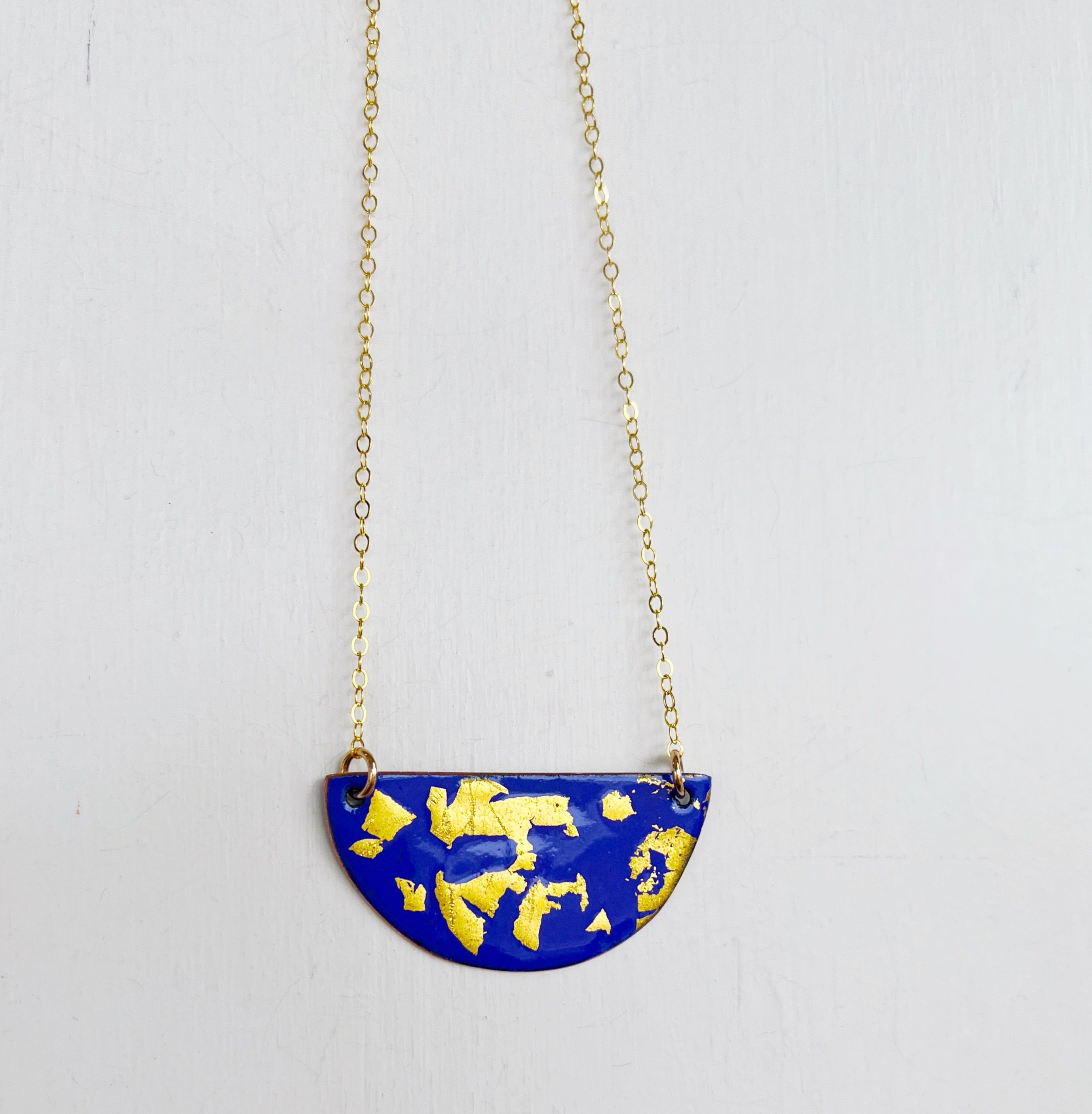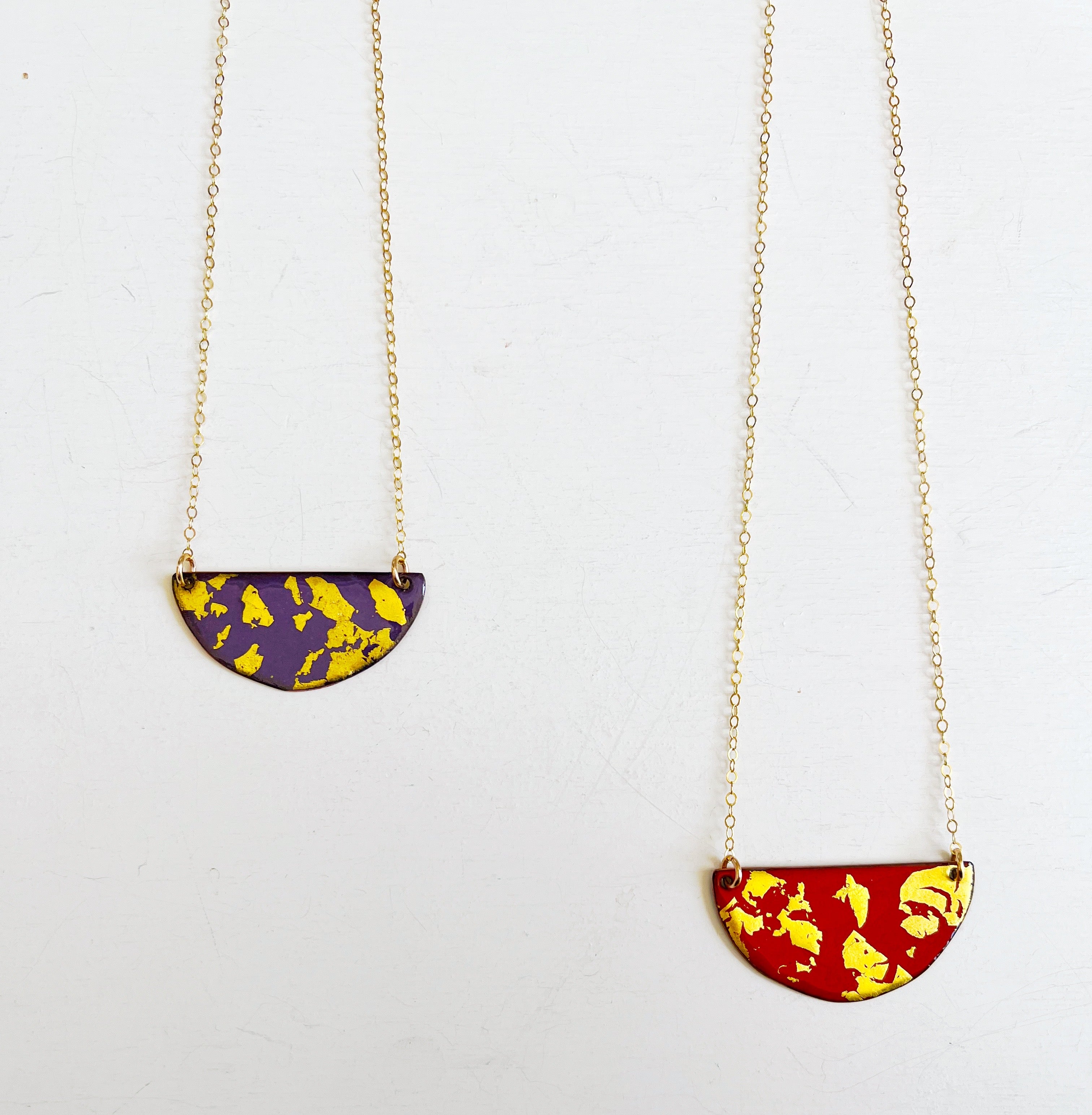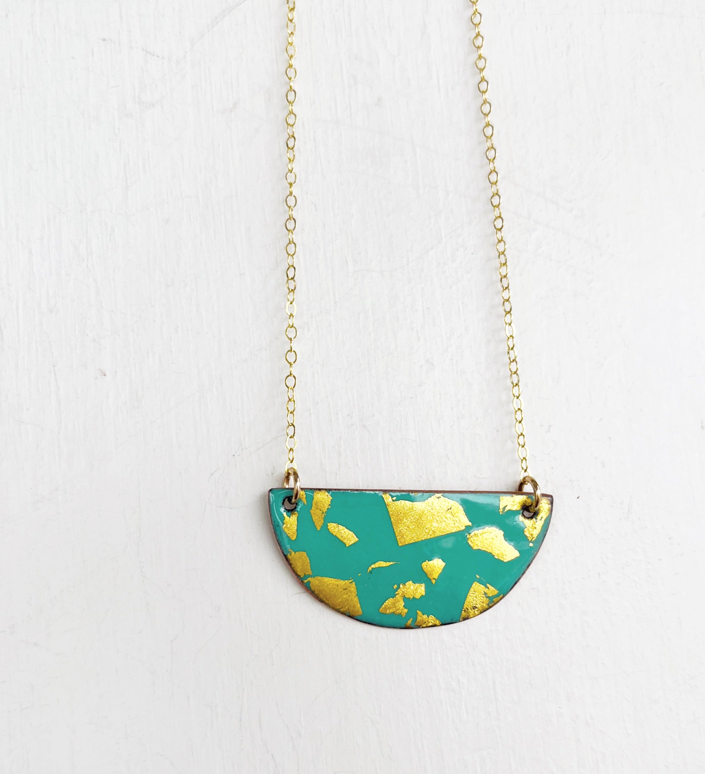 The pendant is hand cut copper sheet and the reverse is a solid contrasting color. So you can be fancy or casual. Chain is 14K gold filled.