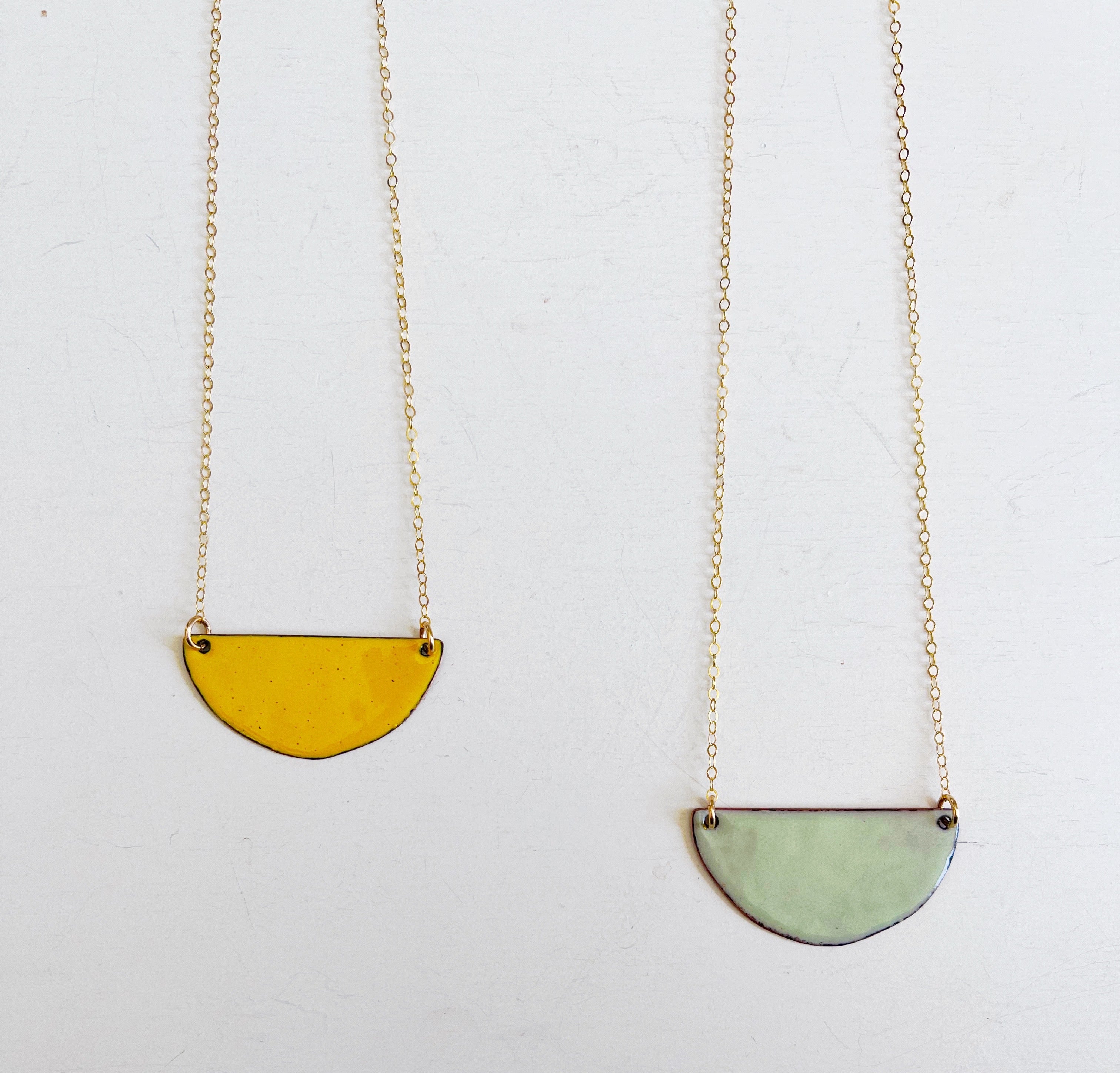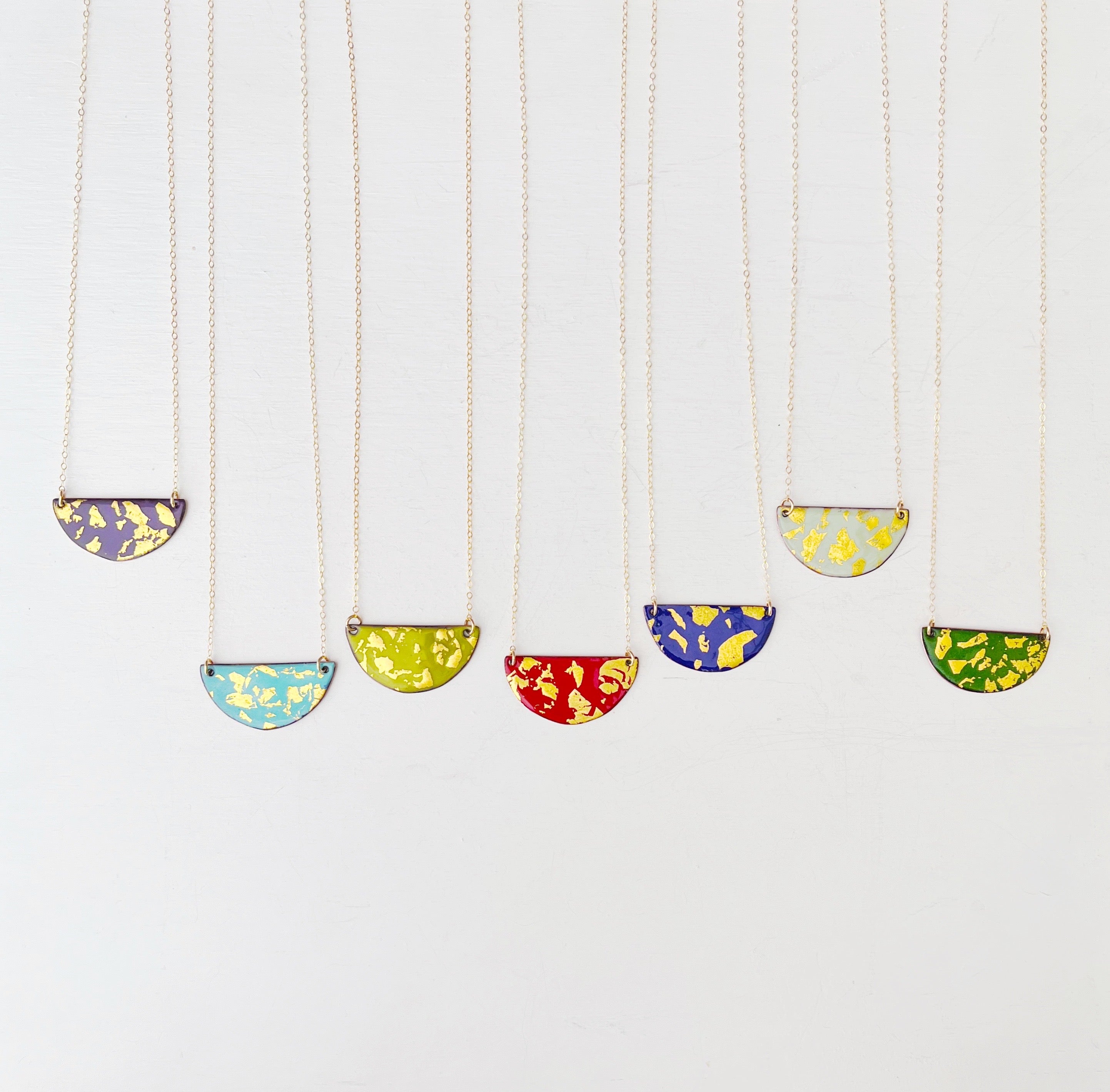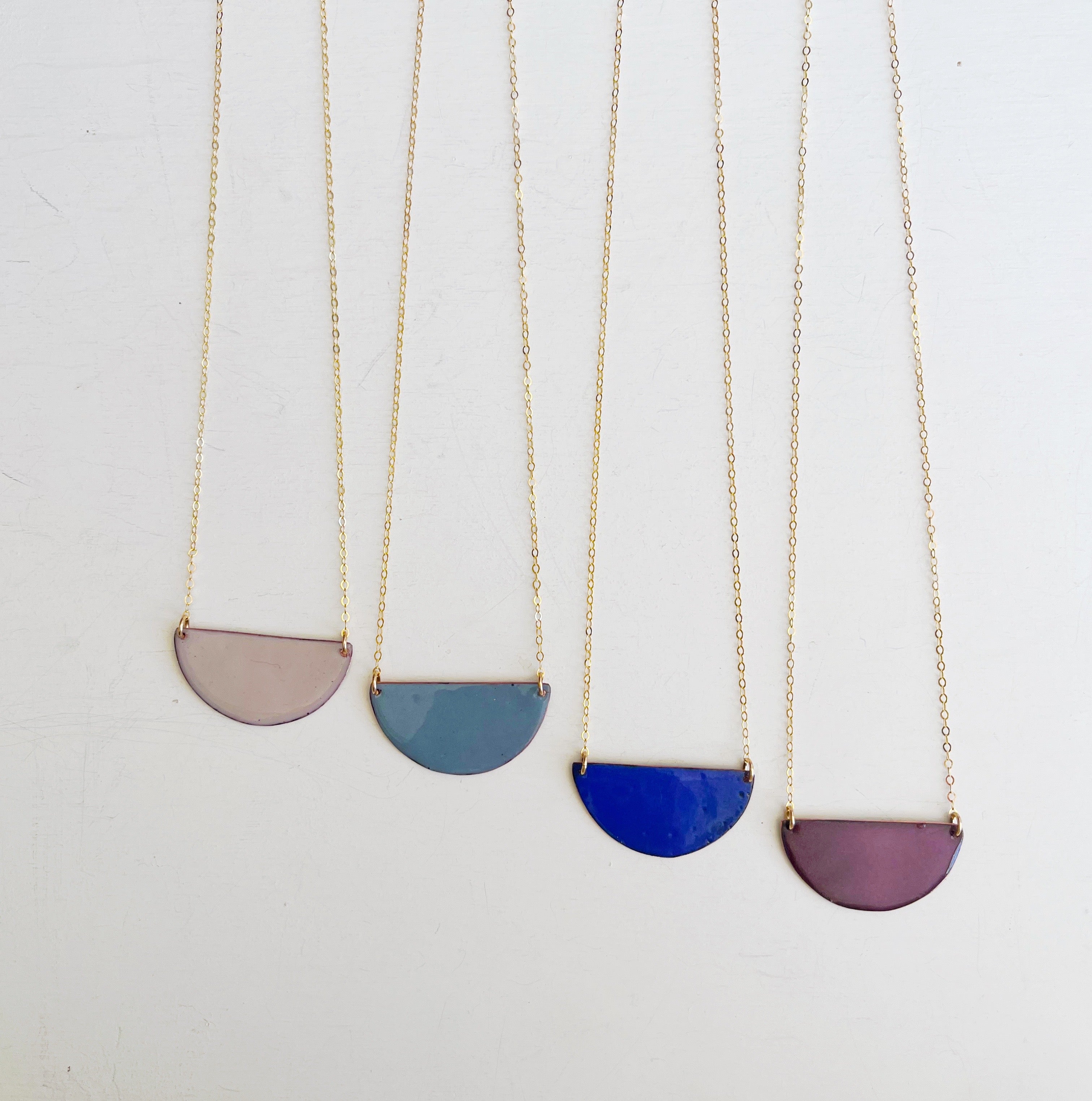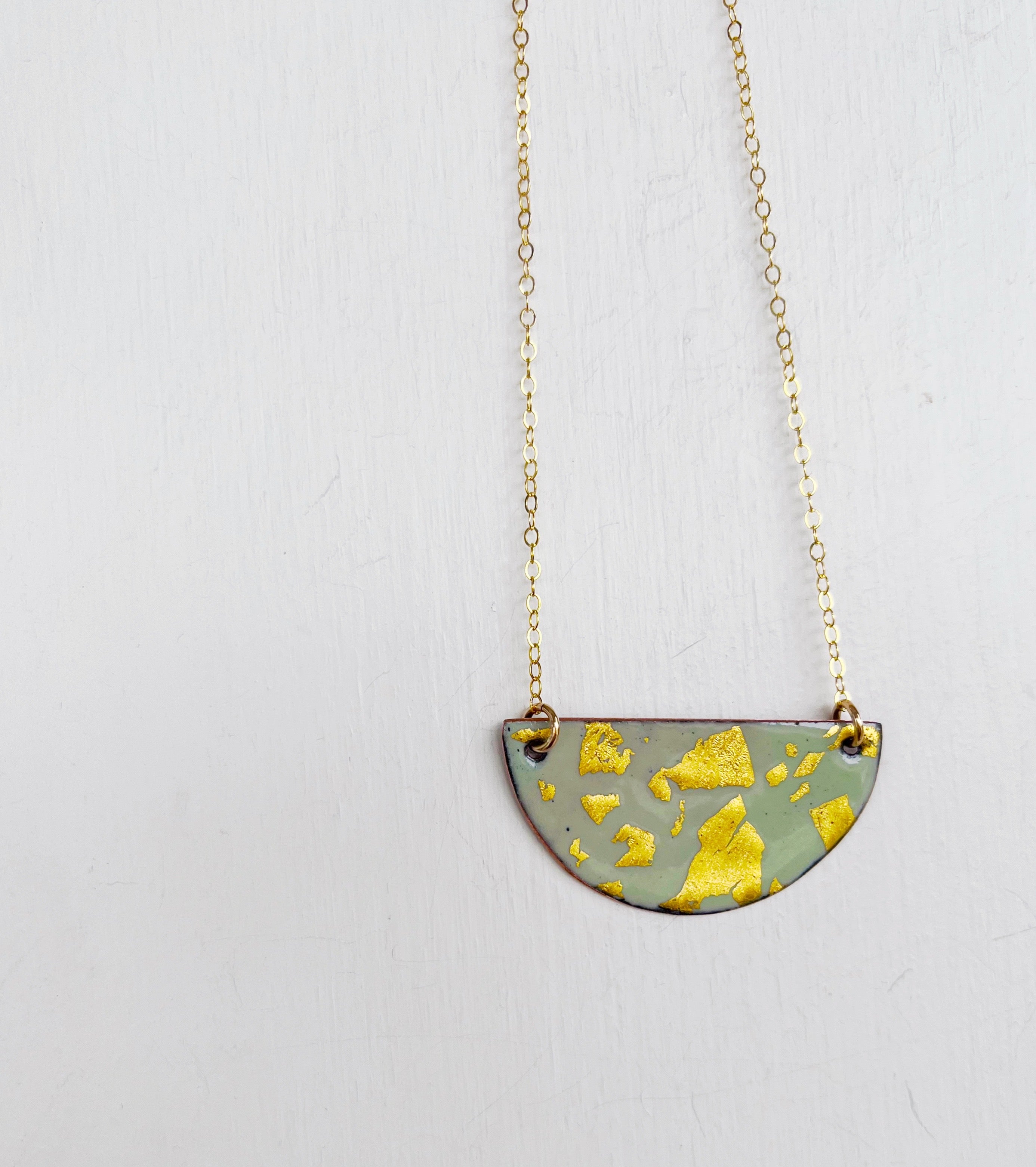 The pendant is hand cut copper sheet and the reverse is a solid contrasting color. So you can be fancy or casual. Chain is 14K gold filled.