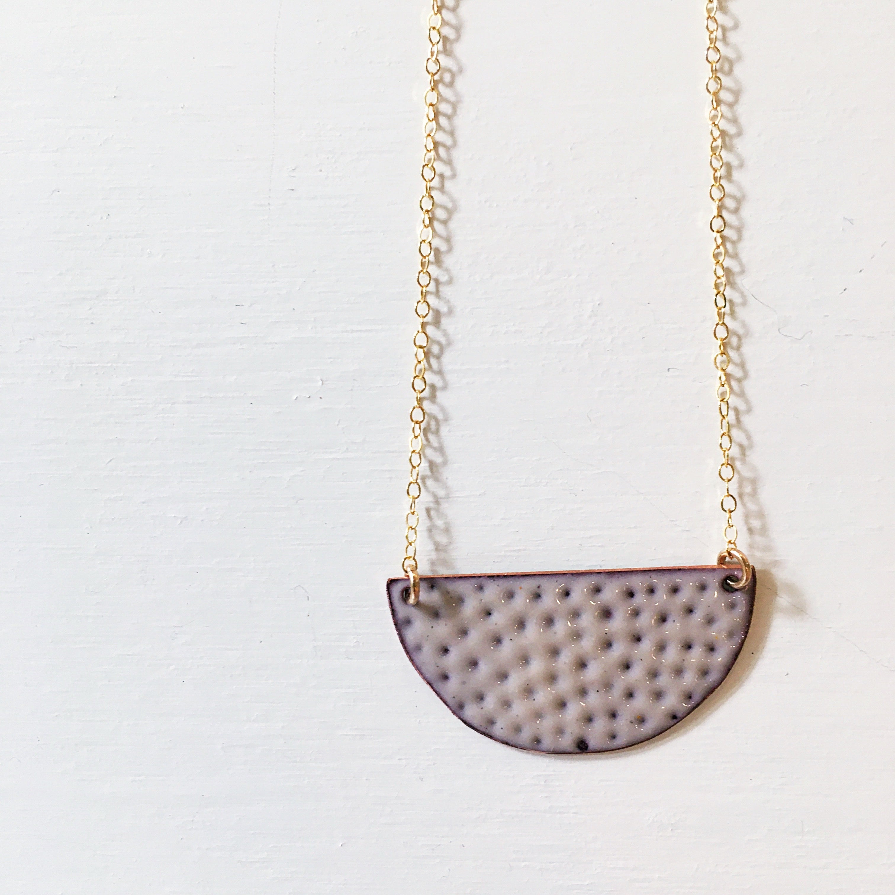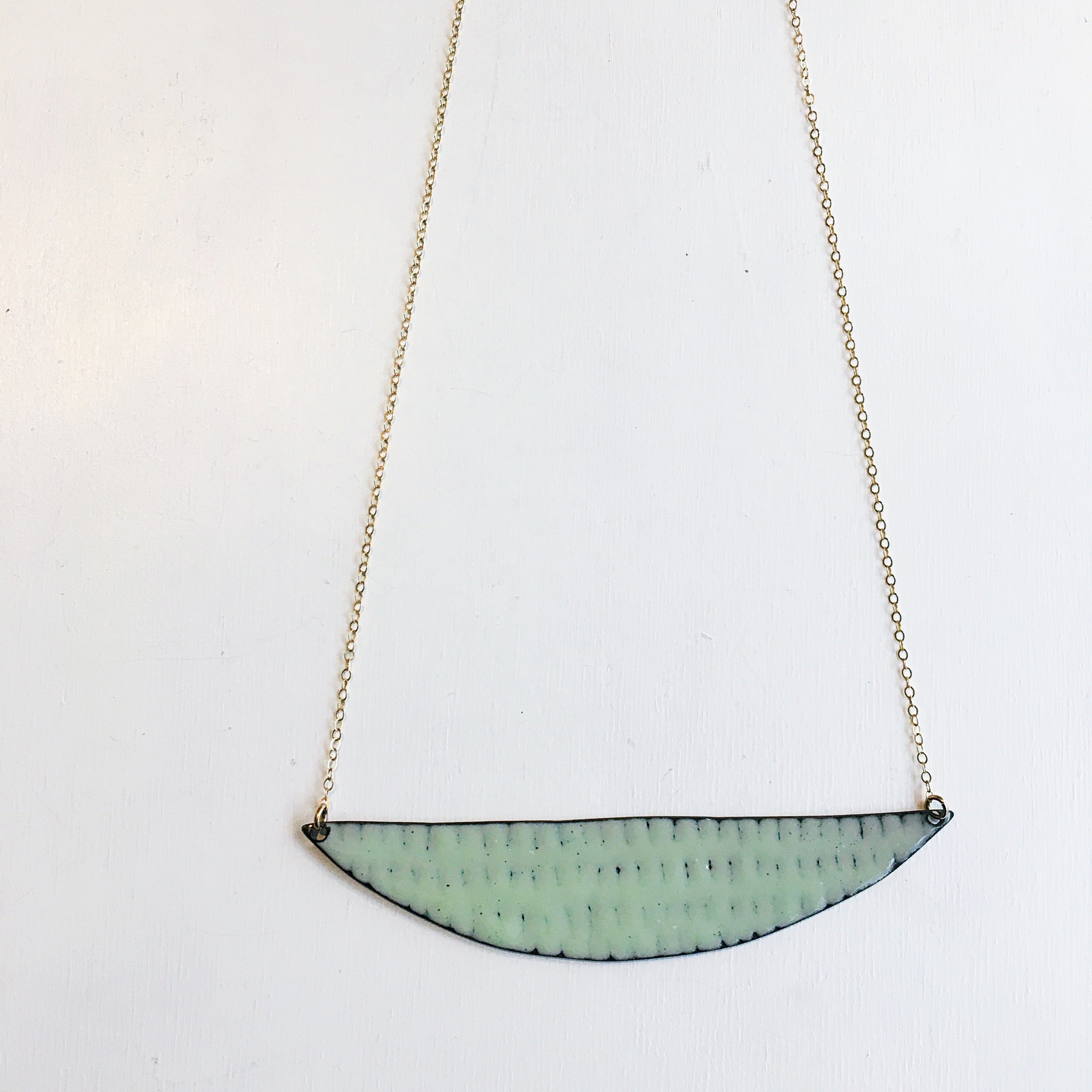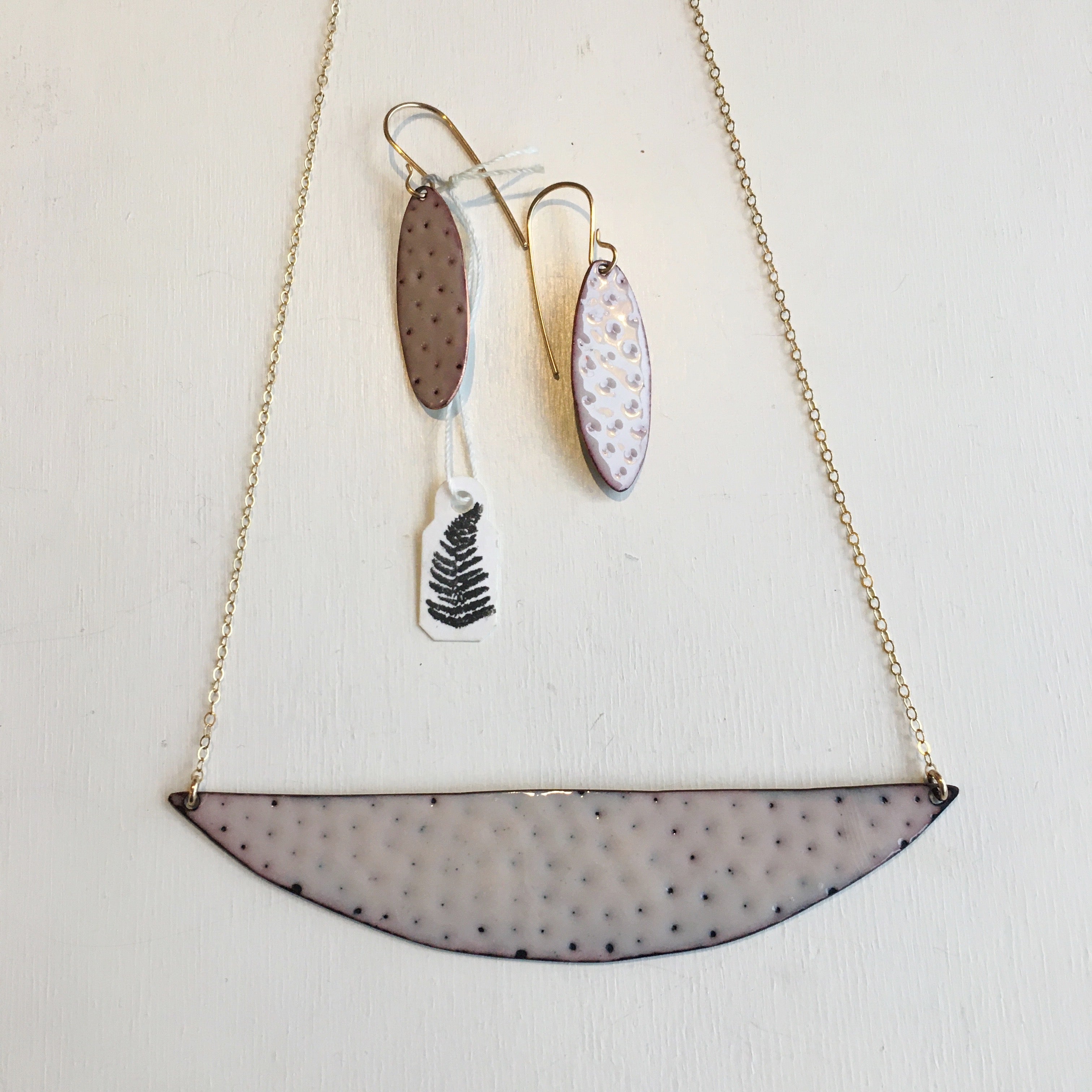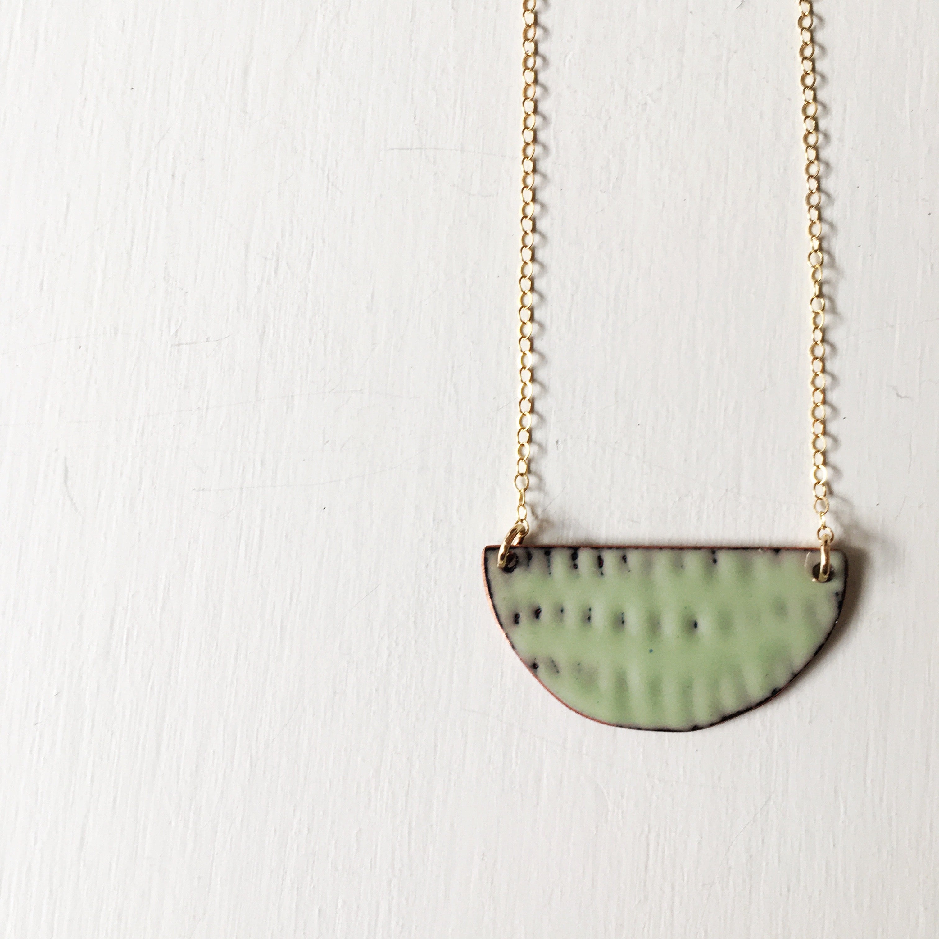 Hand cut copper sheet with blush on one side and pale green on the other. I drew into the enamel before it was fired to make the patterns.