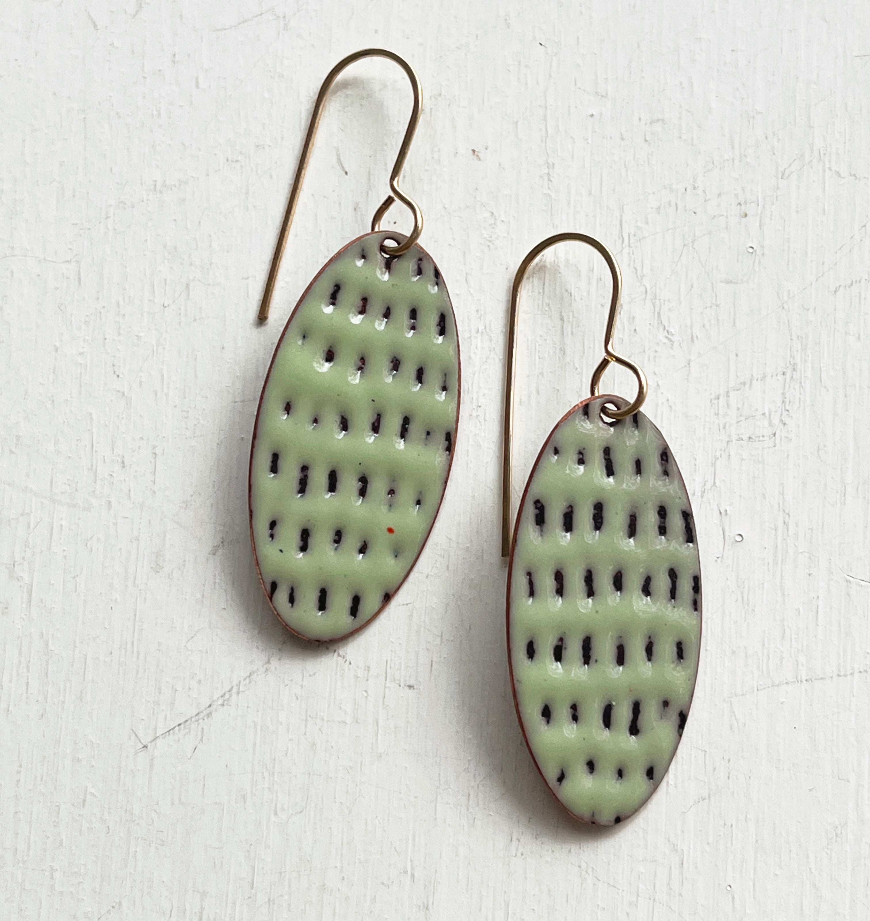 These are "reversible" in that each pair has pale green lines on one side and pale pink polka dots on the other. 1 3/4" from ear hole to bottom of oval. I hand draw the patterns before firing so they also have a bit of texture to them. The lines and dots form where the copper from underneath is exposed and gets oxidized.