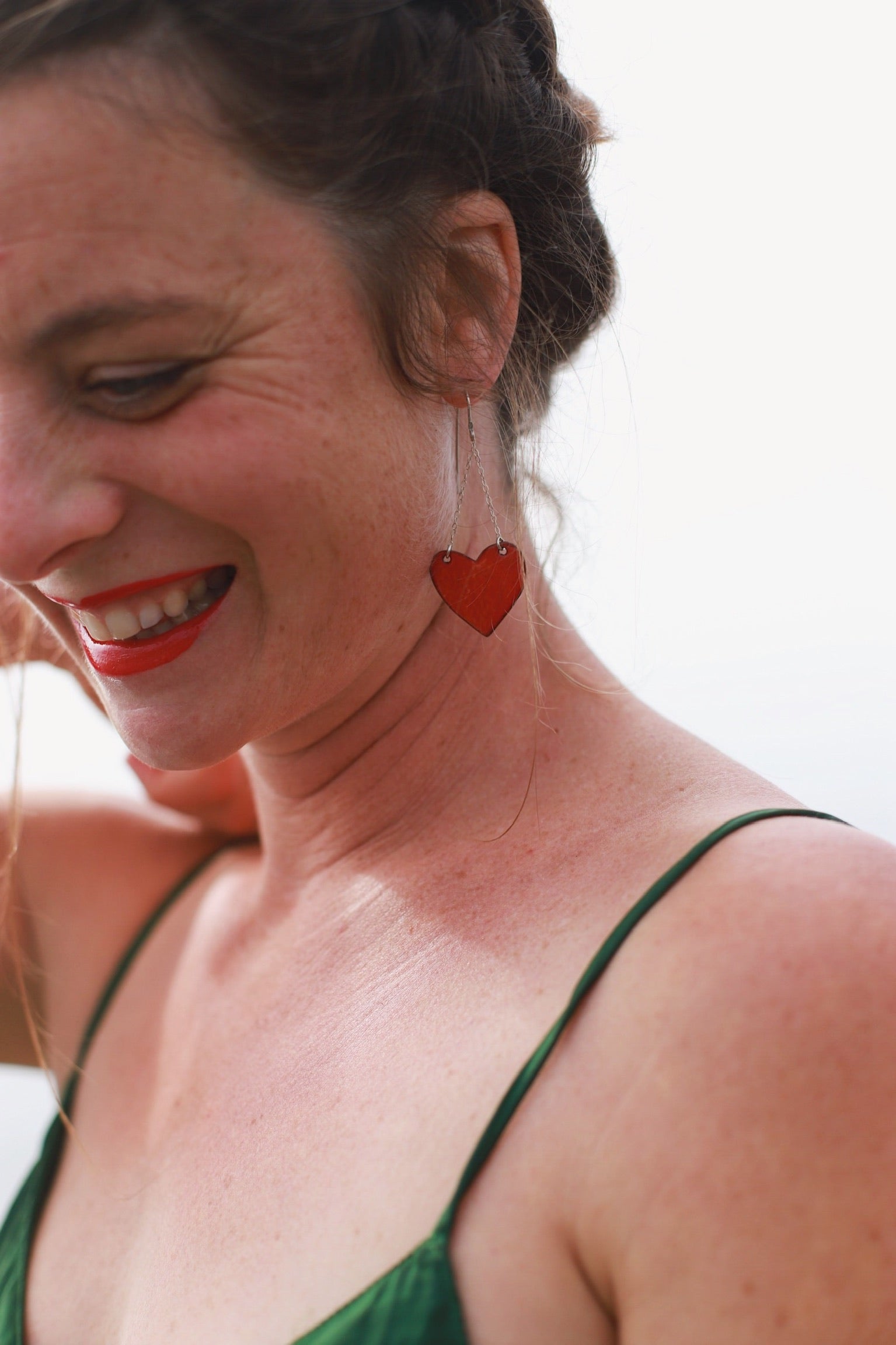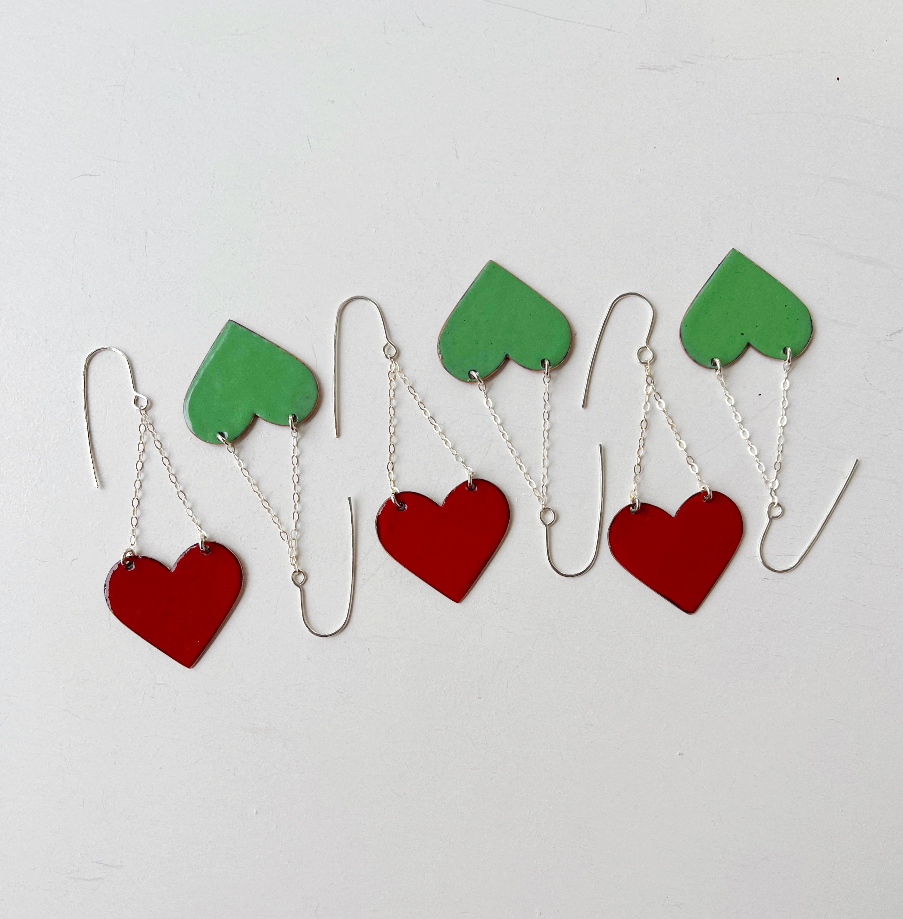 Sometimes hand cut, sometimes laser cut, copper hearts on sterling chain/wire. Two kiln firings of glass enamel. Red on front and mint or purple on the back. 1" hearts that hang 3" from ear hole to tip. Want them in a different color combo? Get in touch and I'll make them custom for you!