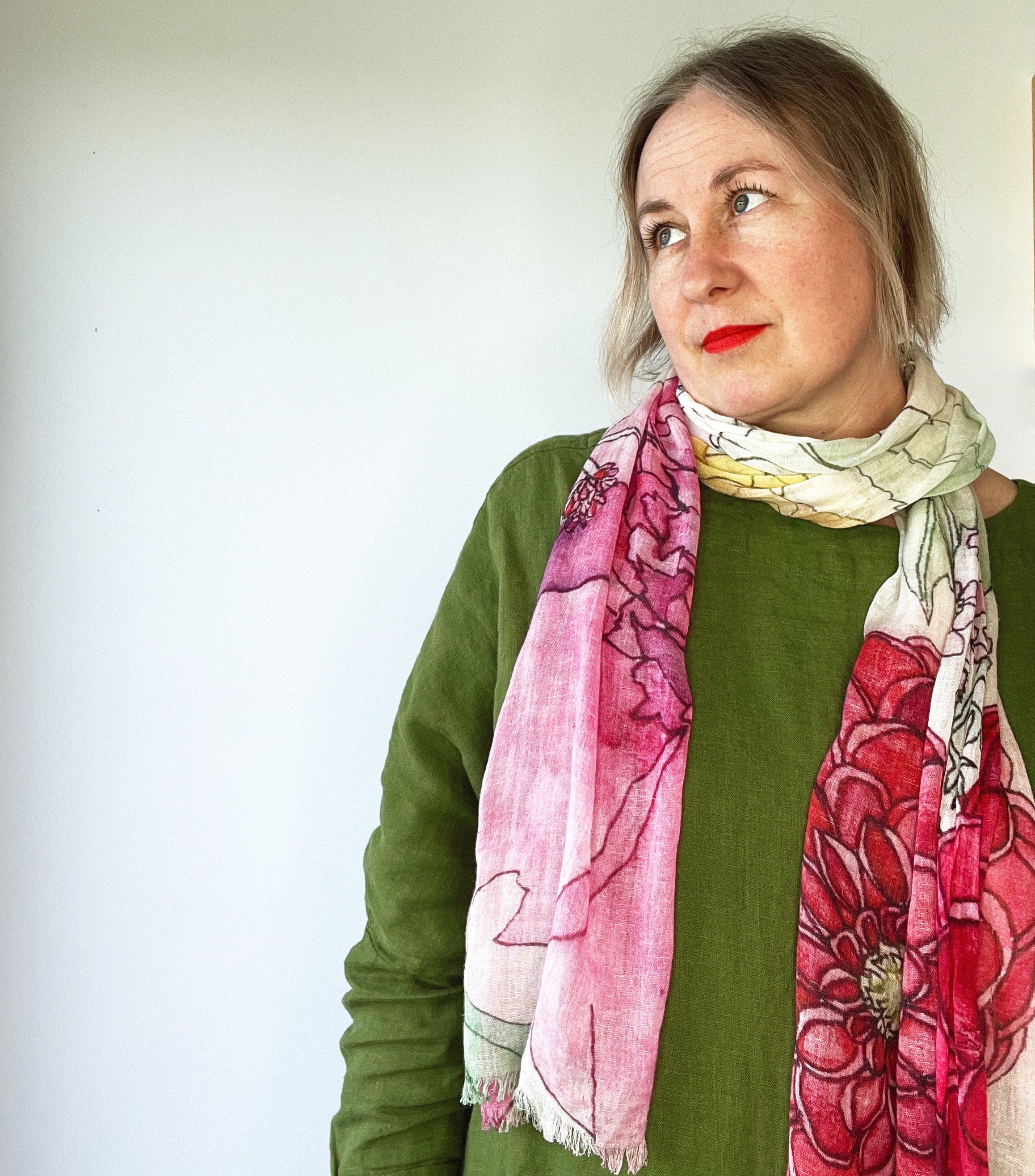 Flower Garden scarf. A blend of 60% cotton, 20% linen, and 20% modal. Digitally printed from a detail of my watercolor painting Flower Garden. This one is especially great for spring and summer but can be worn all year.
