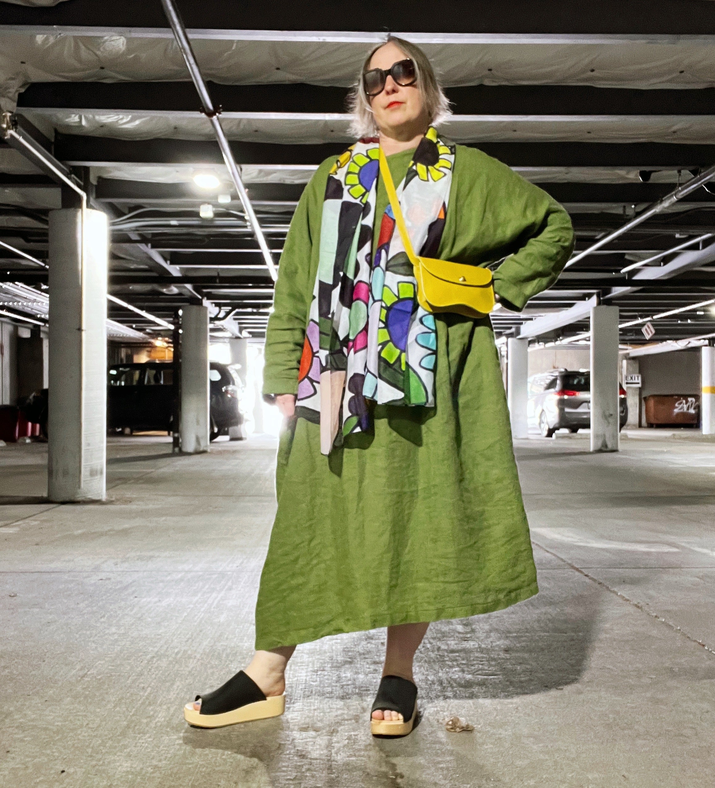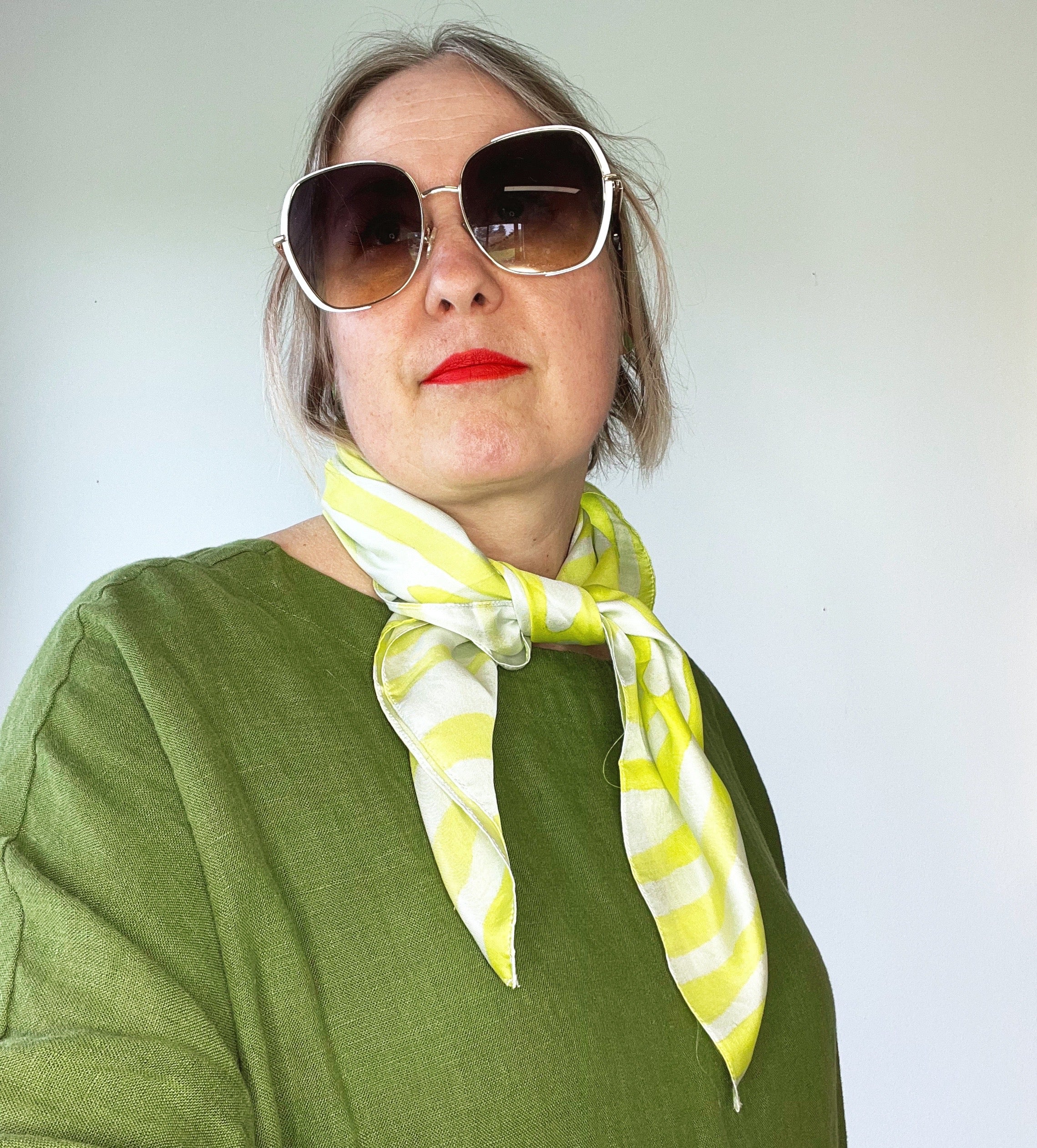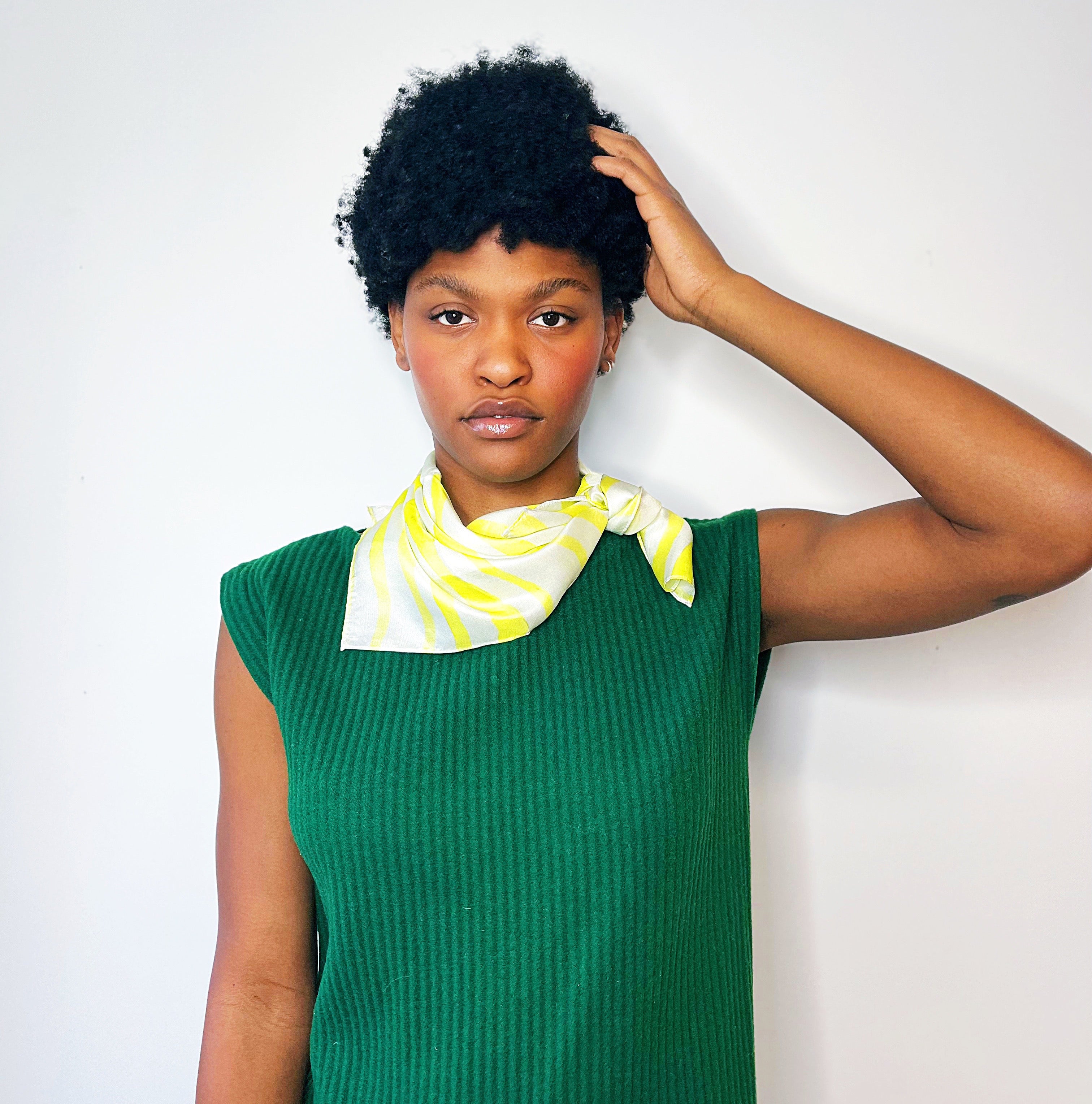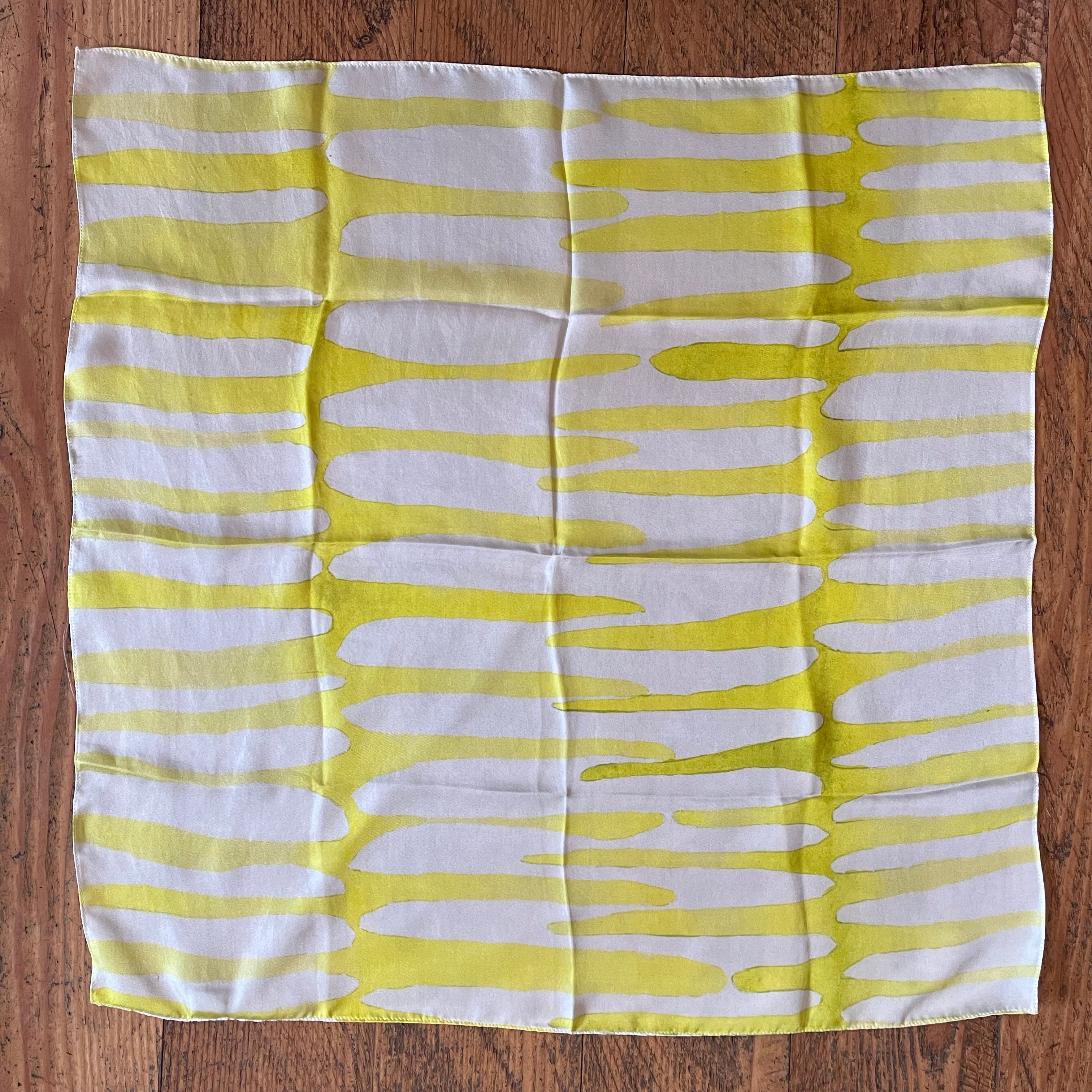 Symbiosis is 100% silk and 24" square. Chartreuse on white. My newest and most luxurious!
