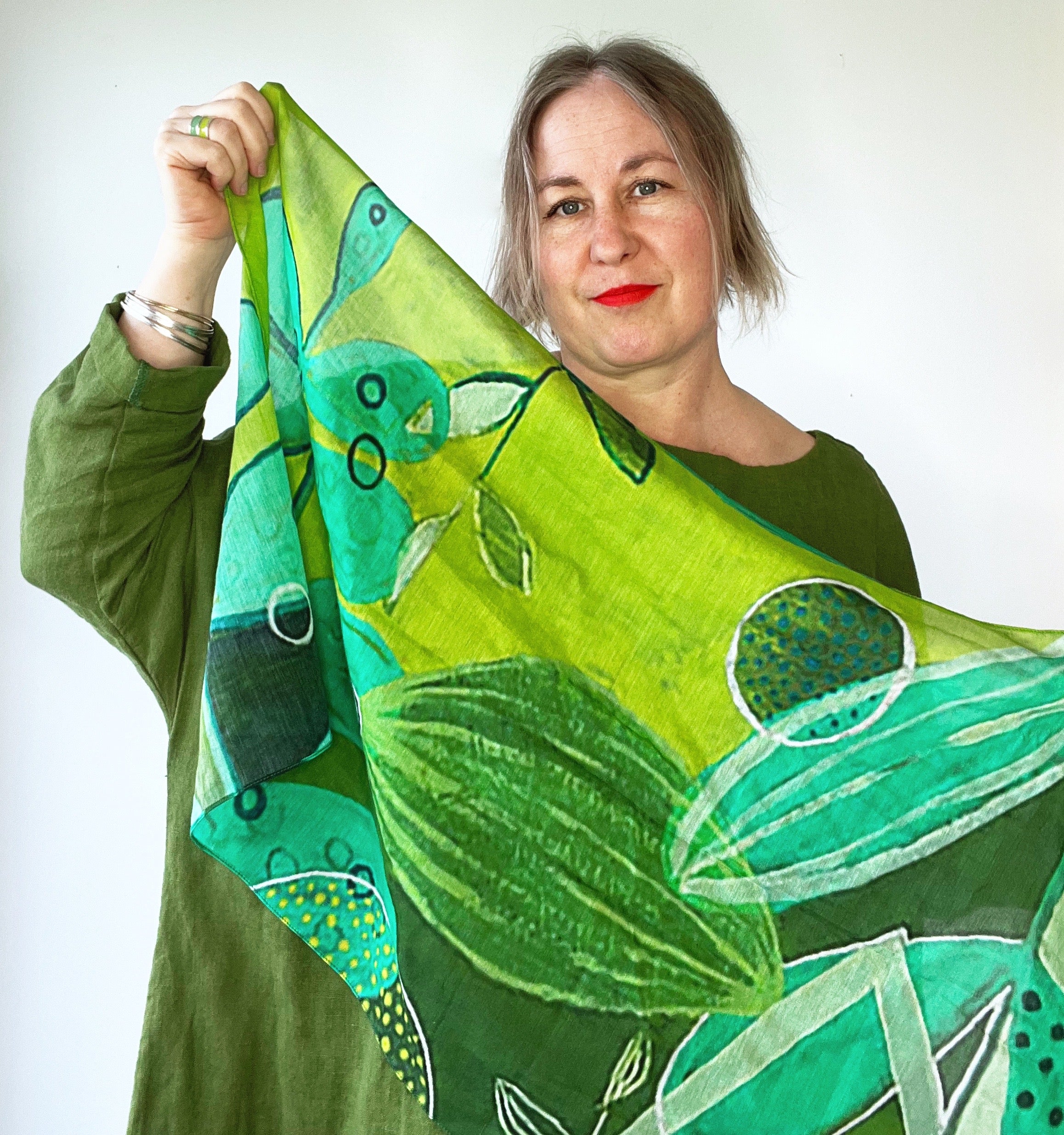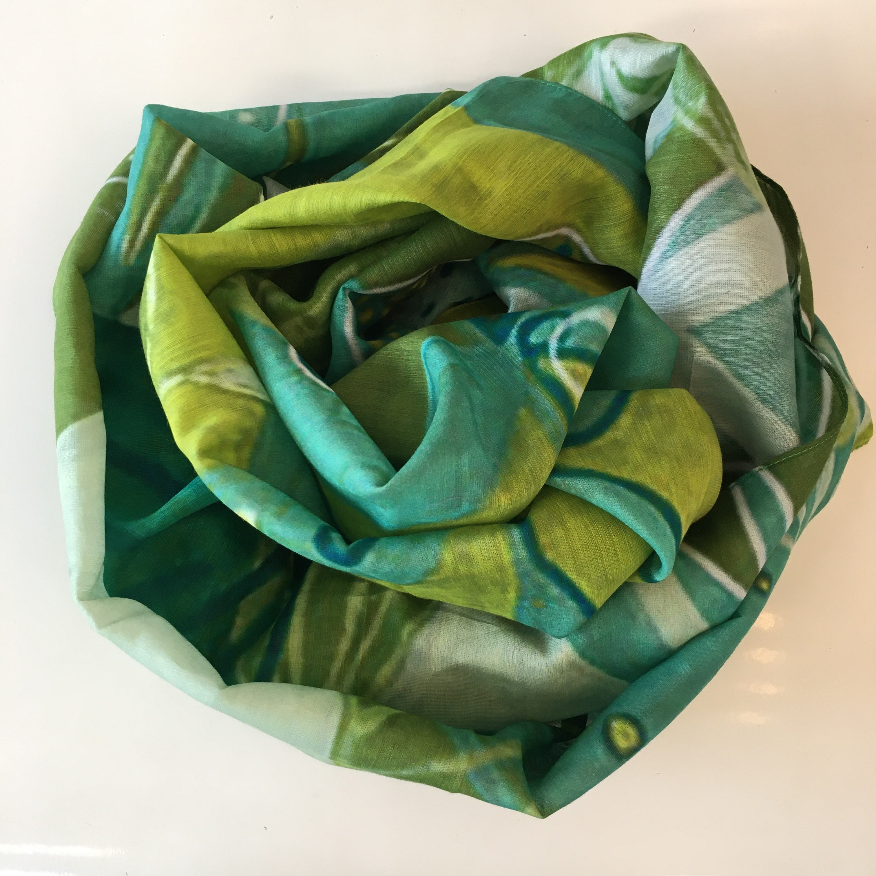 Fern Story scarf. 75% cotton and 25% silk. Digitally printed from a detail of my painting Fern Story in vibrant shades of green ,white, and aqua. Perfect for all seasons.