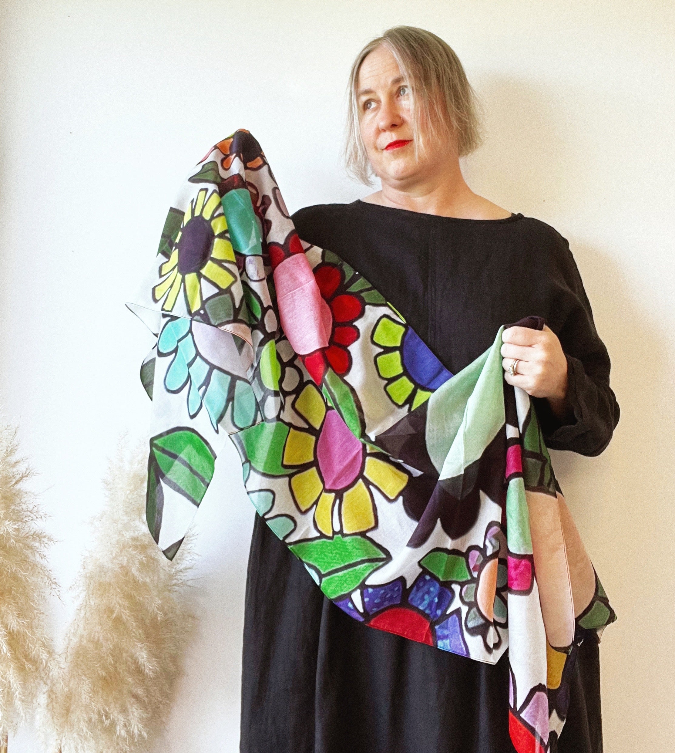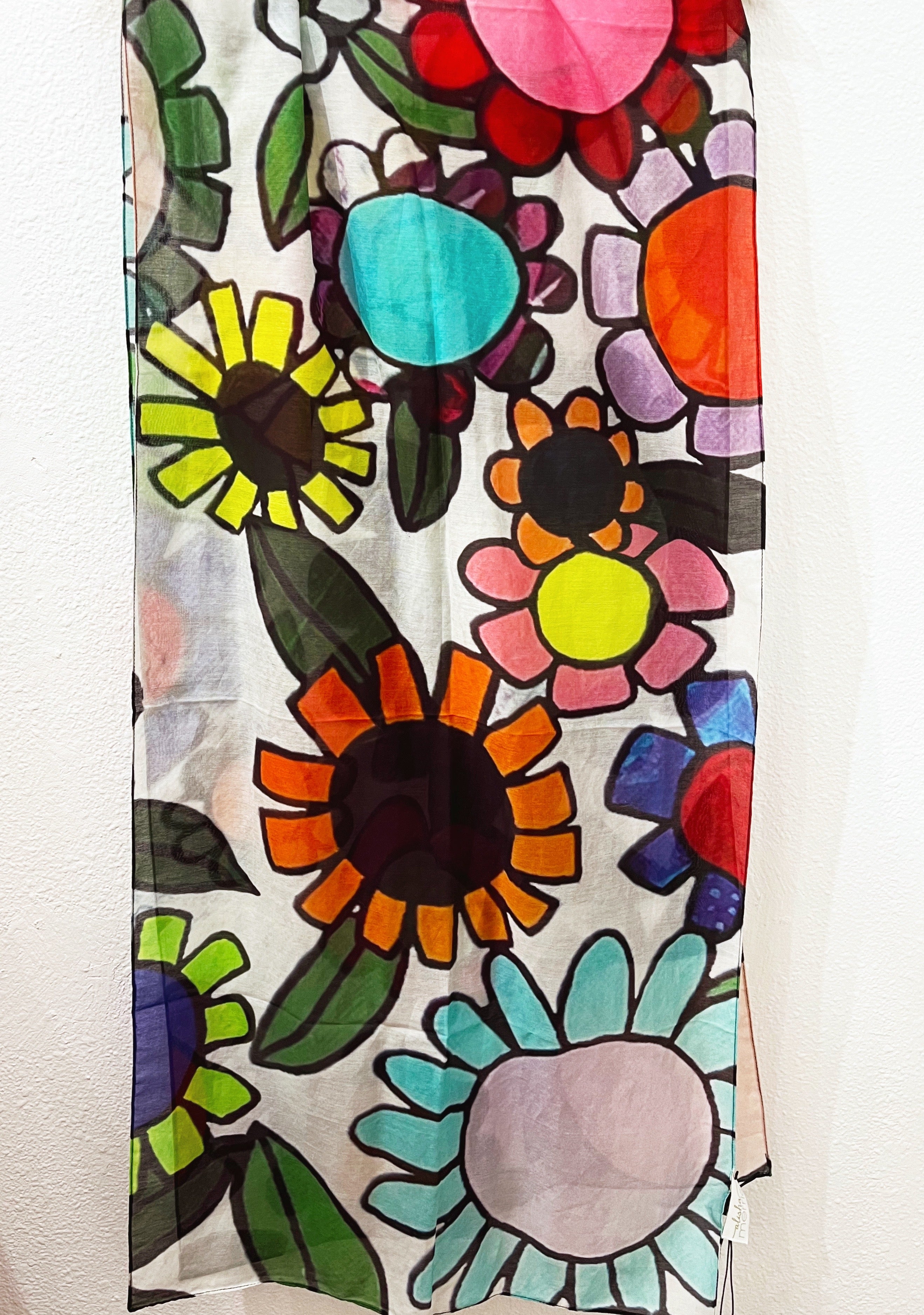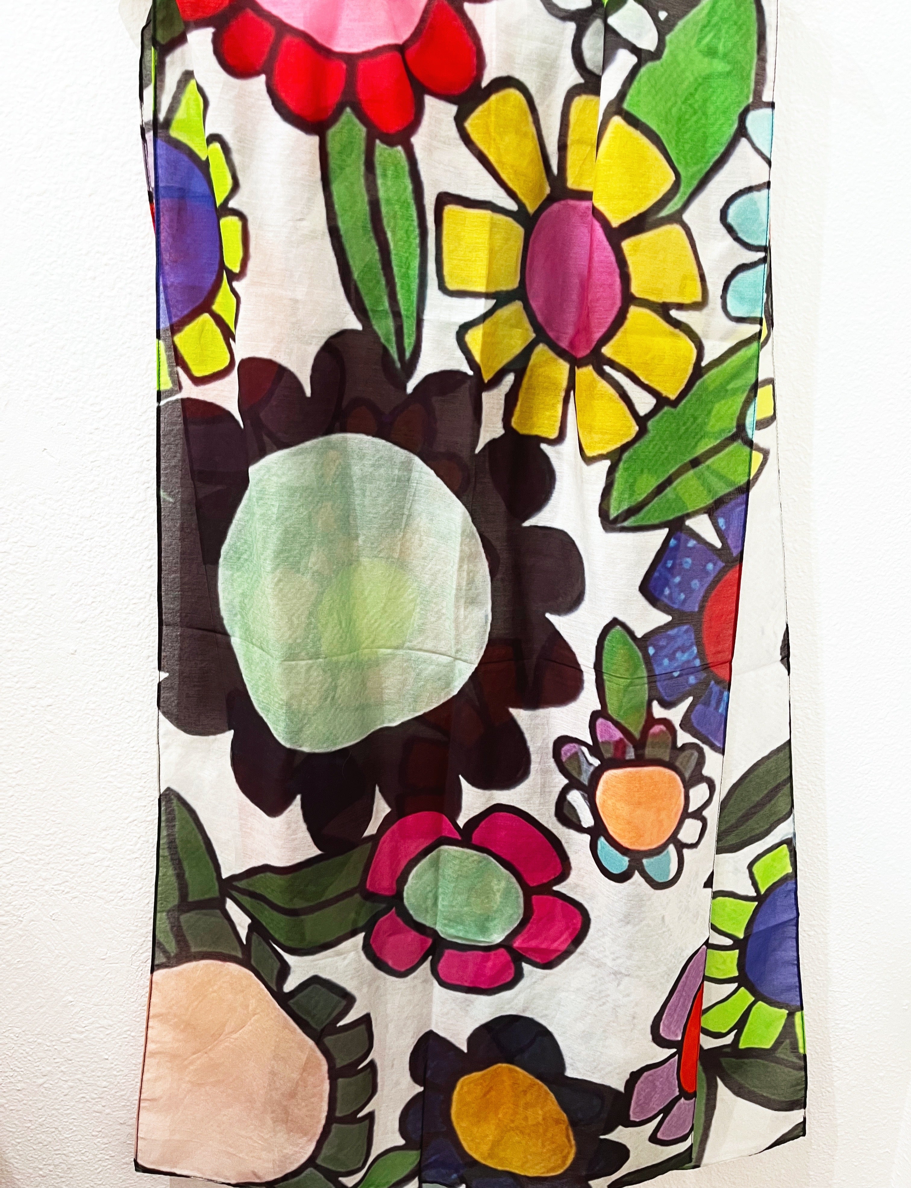 Flower Power scarf. NEW! Cotton and silk. A digital print of my painting of the same name. Buttery soft. Goes with everything!