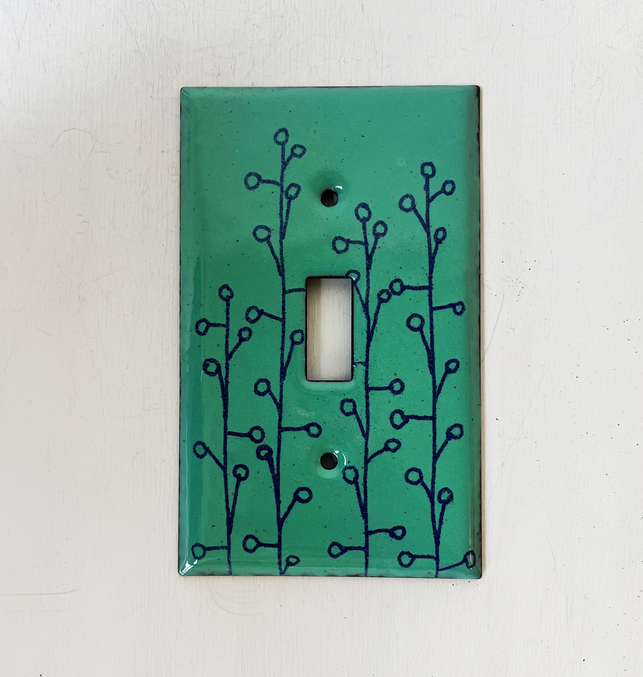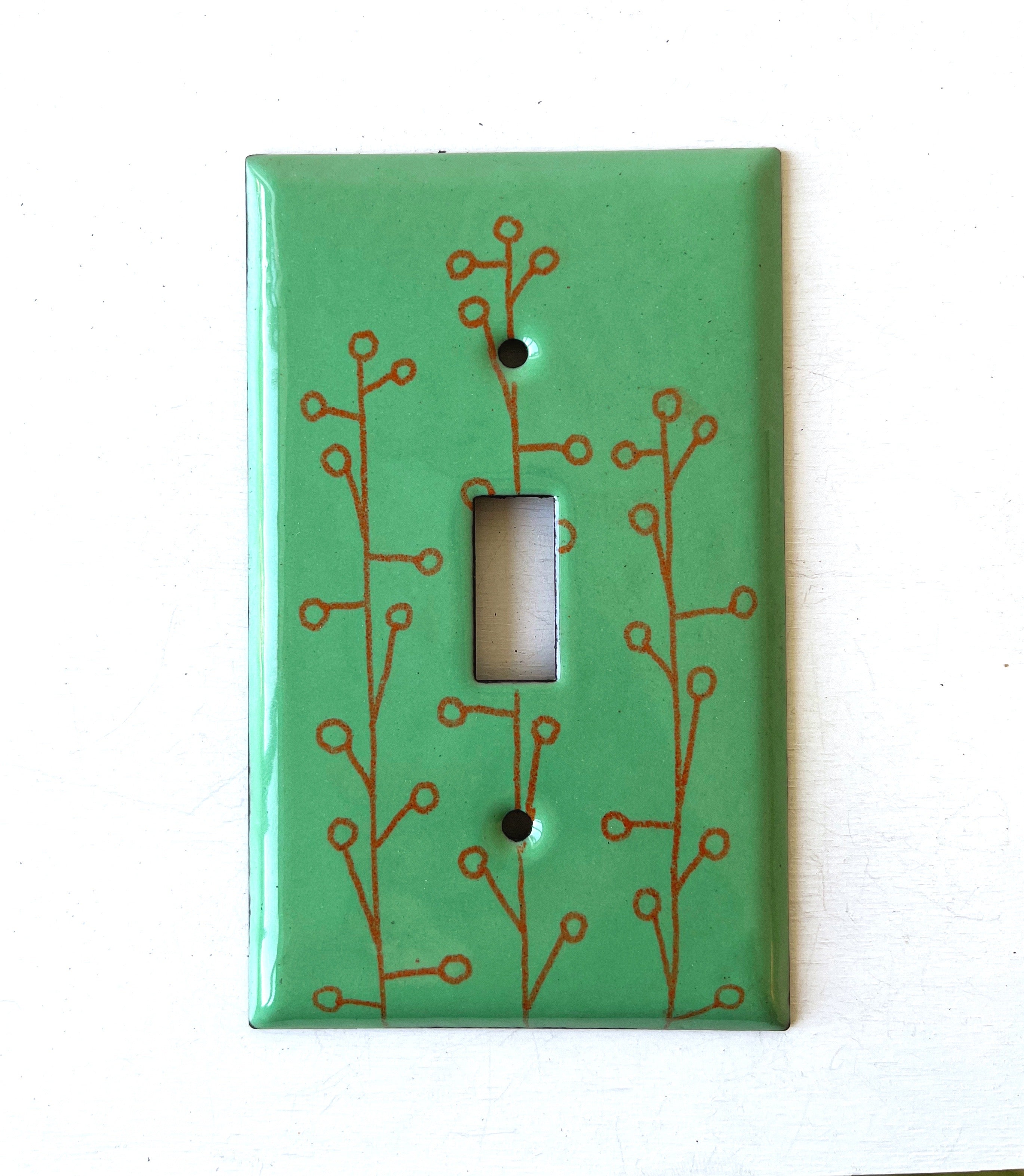 Each light switch plate is kiln fired twice and hand drawn. They are standard size, signed and dated on the back, and come with "copper" screws.