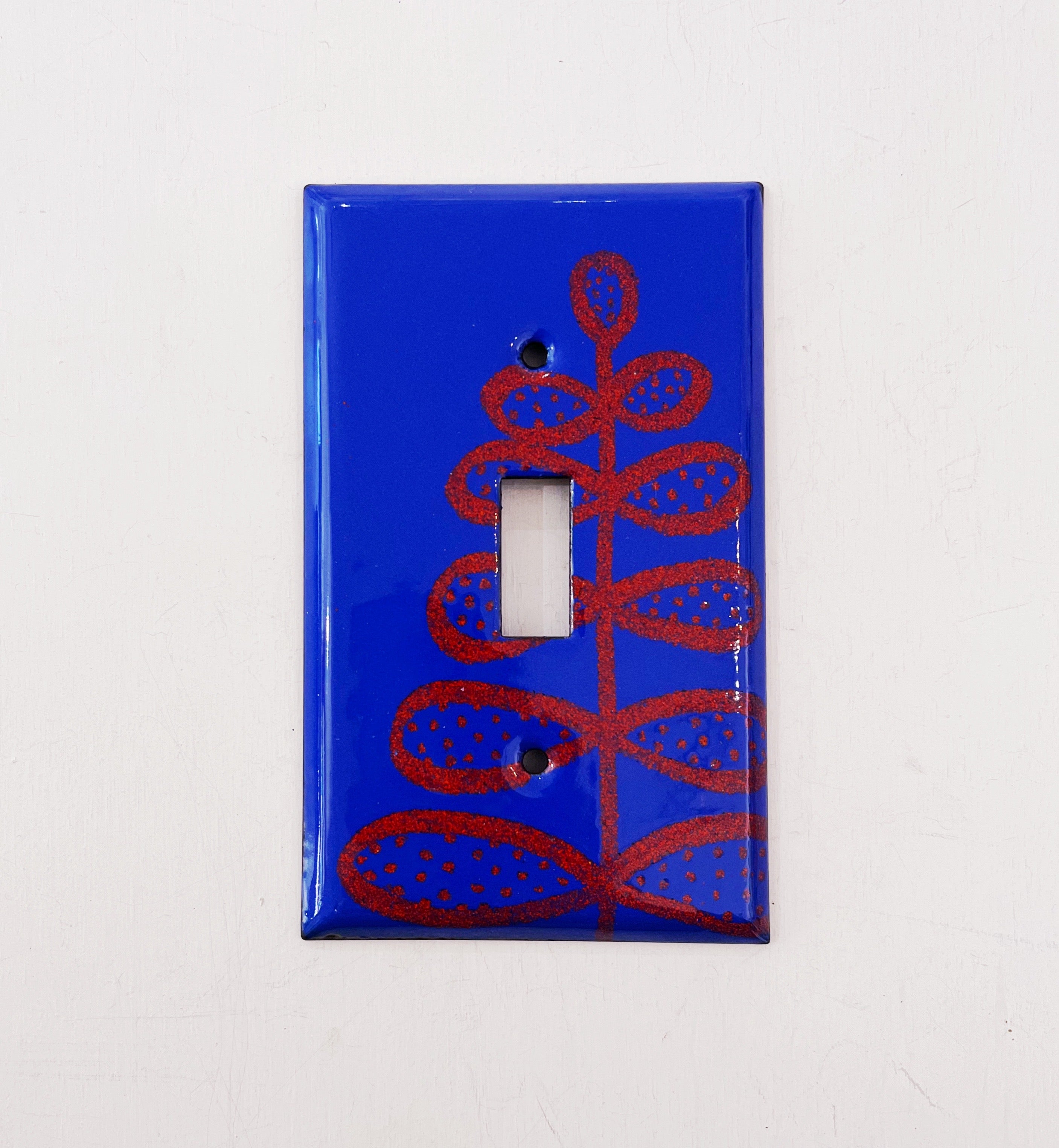 Three kiln firings of glass enamel on stamped copper. Cobalt blue with a hand drawn fern pattern in red-orange. (This blue is a challenge to photograph)!