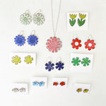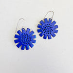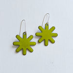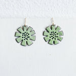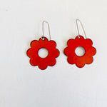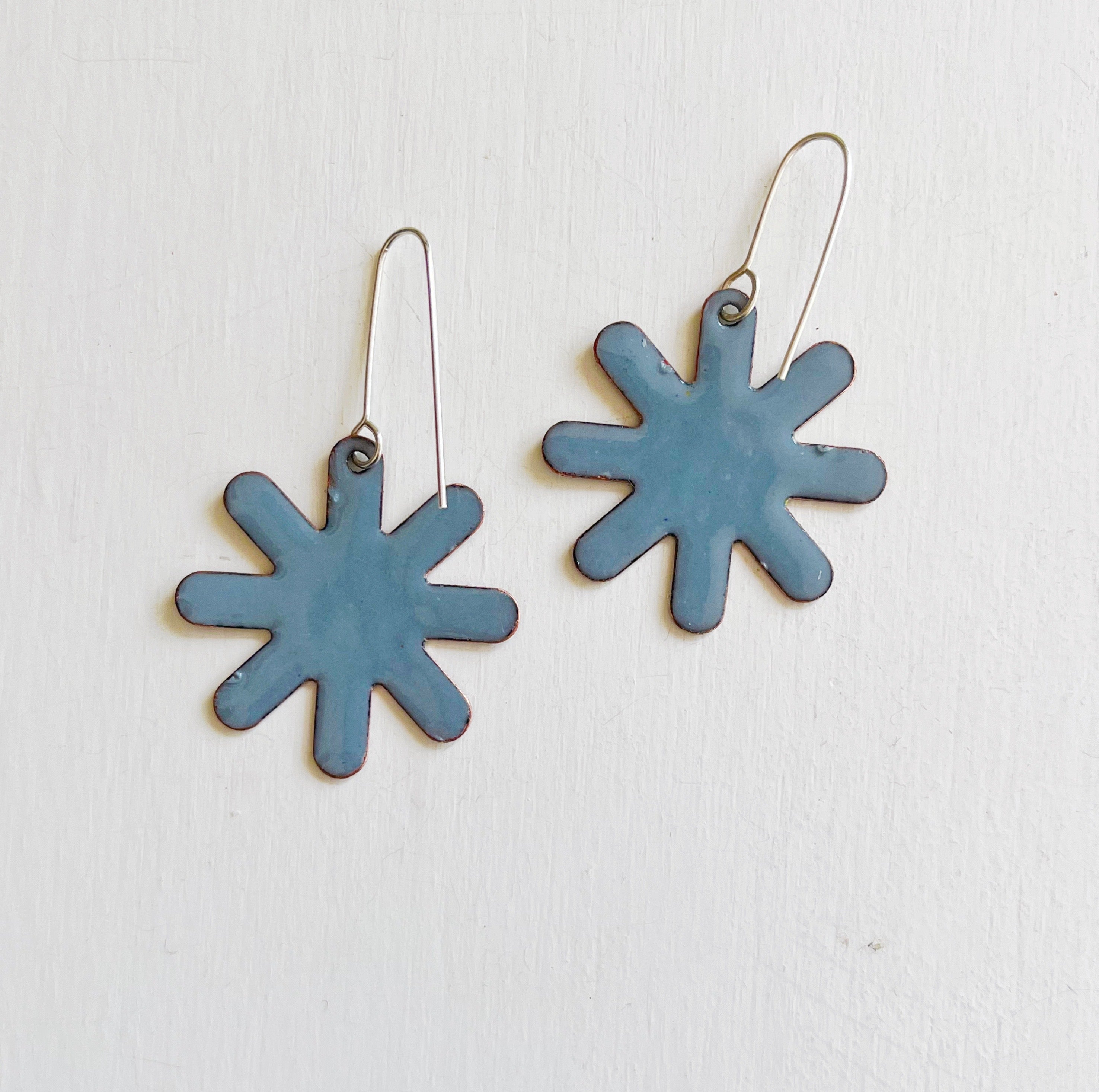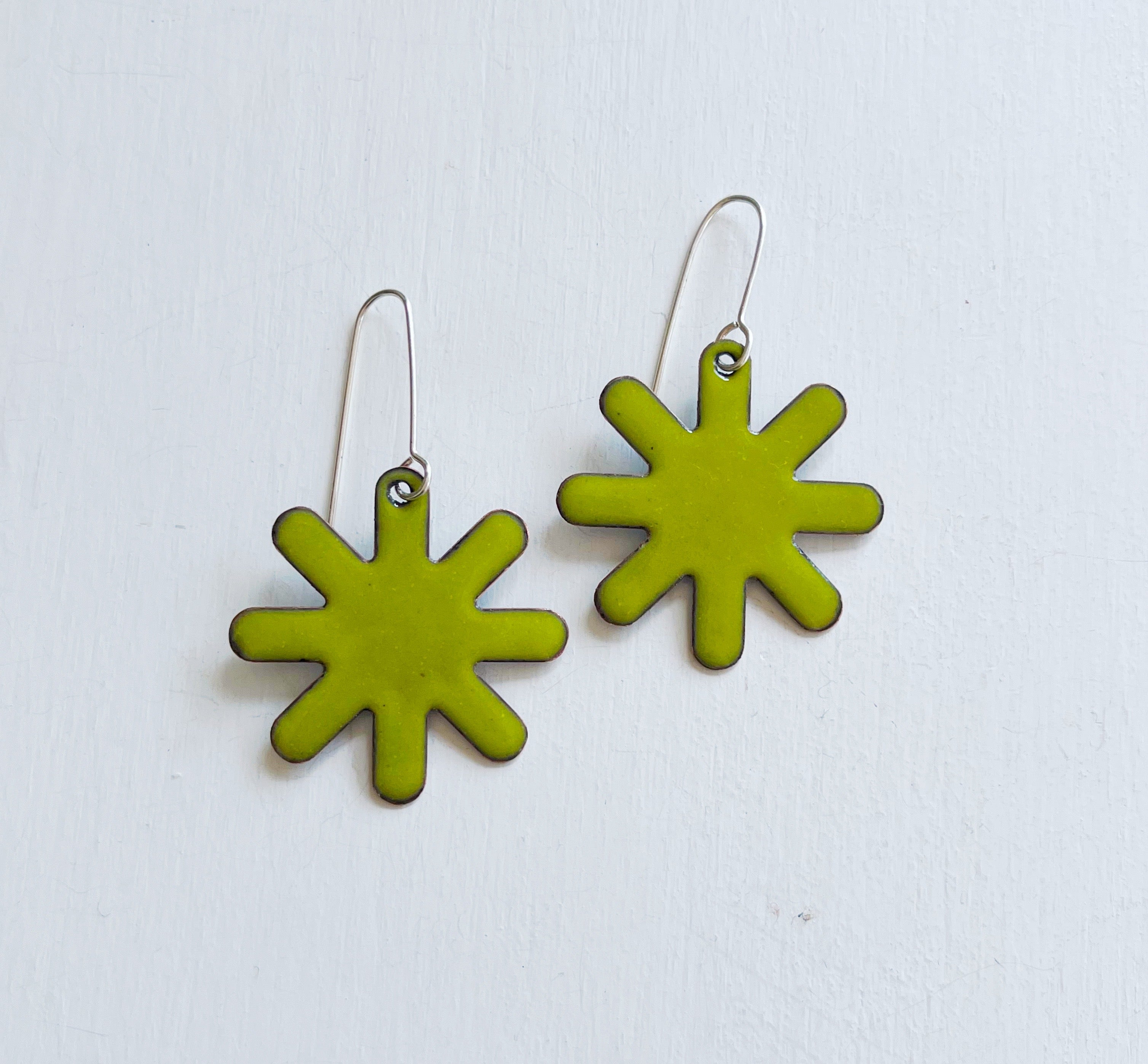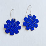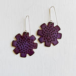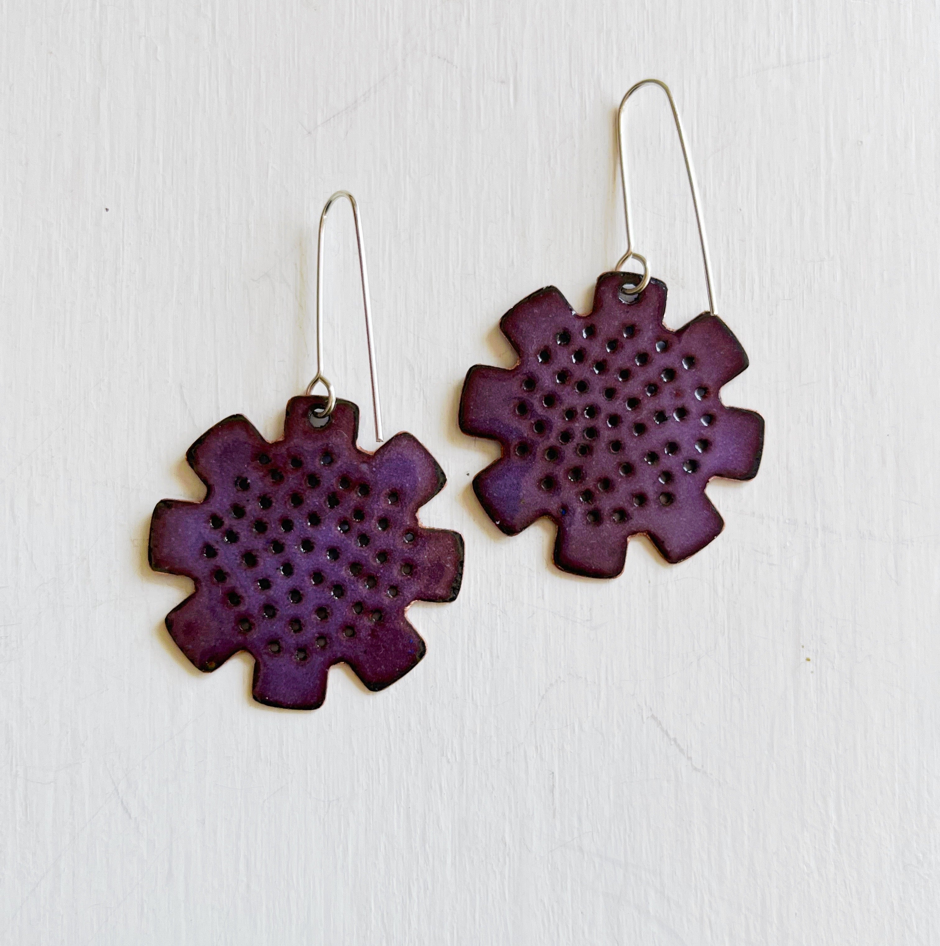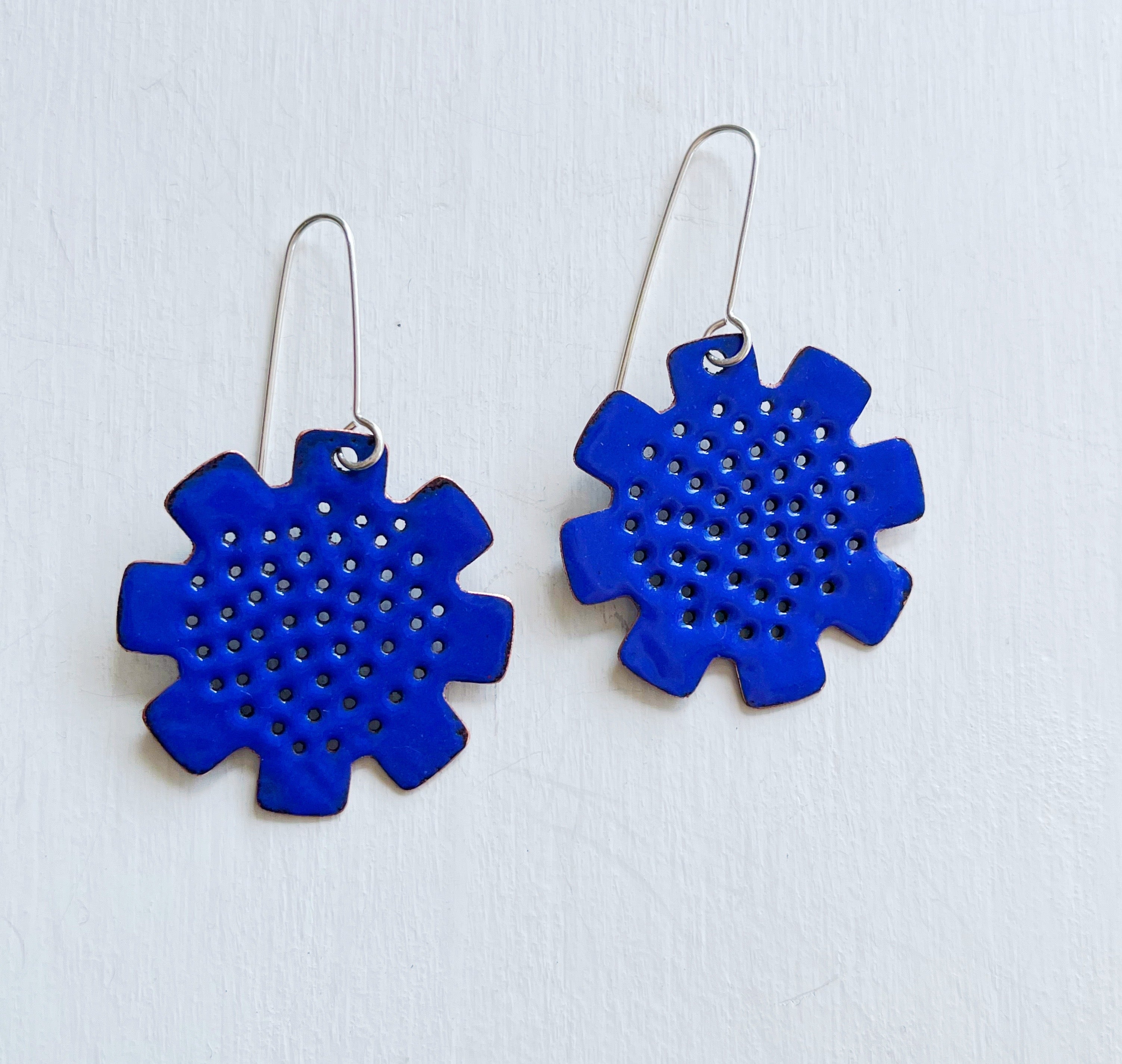 Laser cut and hand drilled out of sheet copper. The dangle style are enameled with contrasting colors on the back. The studs have sterling silver posts. Kiln fired with love.