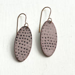 These are "reversible" in that each pair has pale green lines on one side and pale pink polka dots on the other. 1 3/4" from ear hole to bottom of oval. I hand draw the patterns before firing so they also have a bit of texture to them. The lines and dots form where the copper from underneath is exposed and gets oxidized.