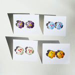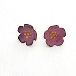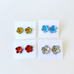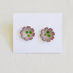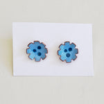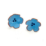 Made one pair at a time! These are hand formed from copper sheet. The ear posts are sterling silver. Just under 1/2" in size. Kiln fired glass enamel and my newest experiment with enamel overglaze for the dots!