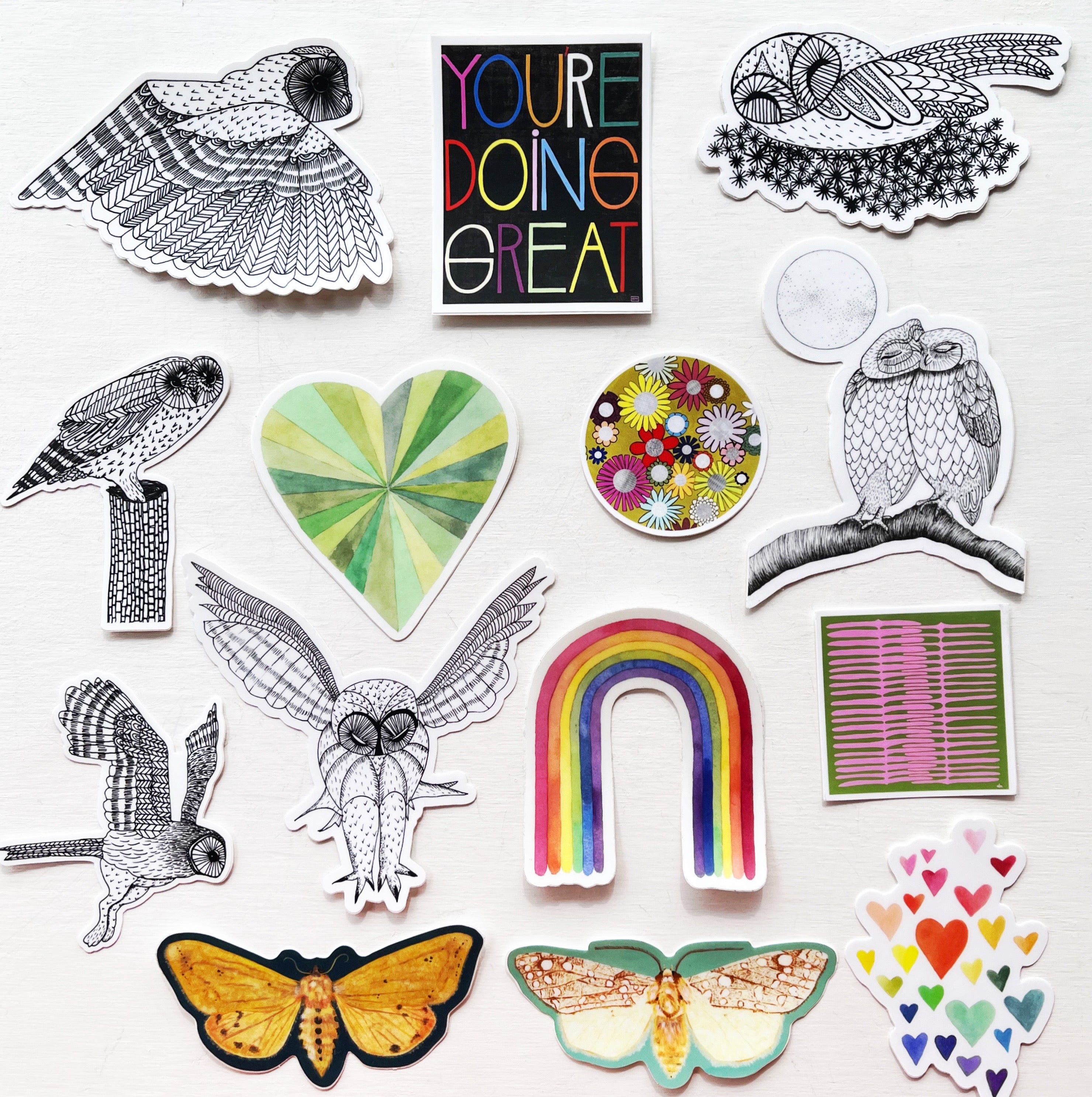 Sweet little stickers of my drawings and paintings. I love them and hope you do too! Waterproof and durable for your water bottle, car, laptop, or.....anywhere!