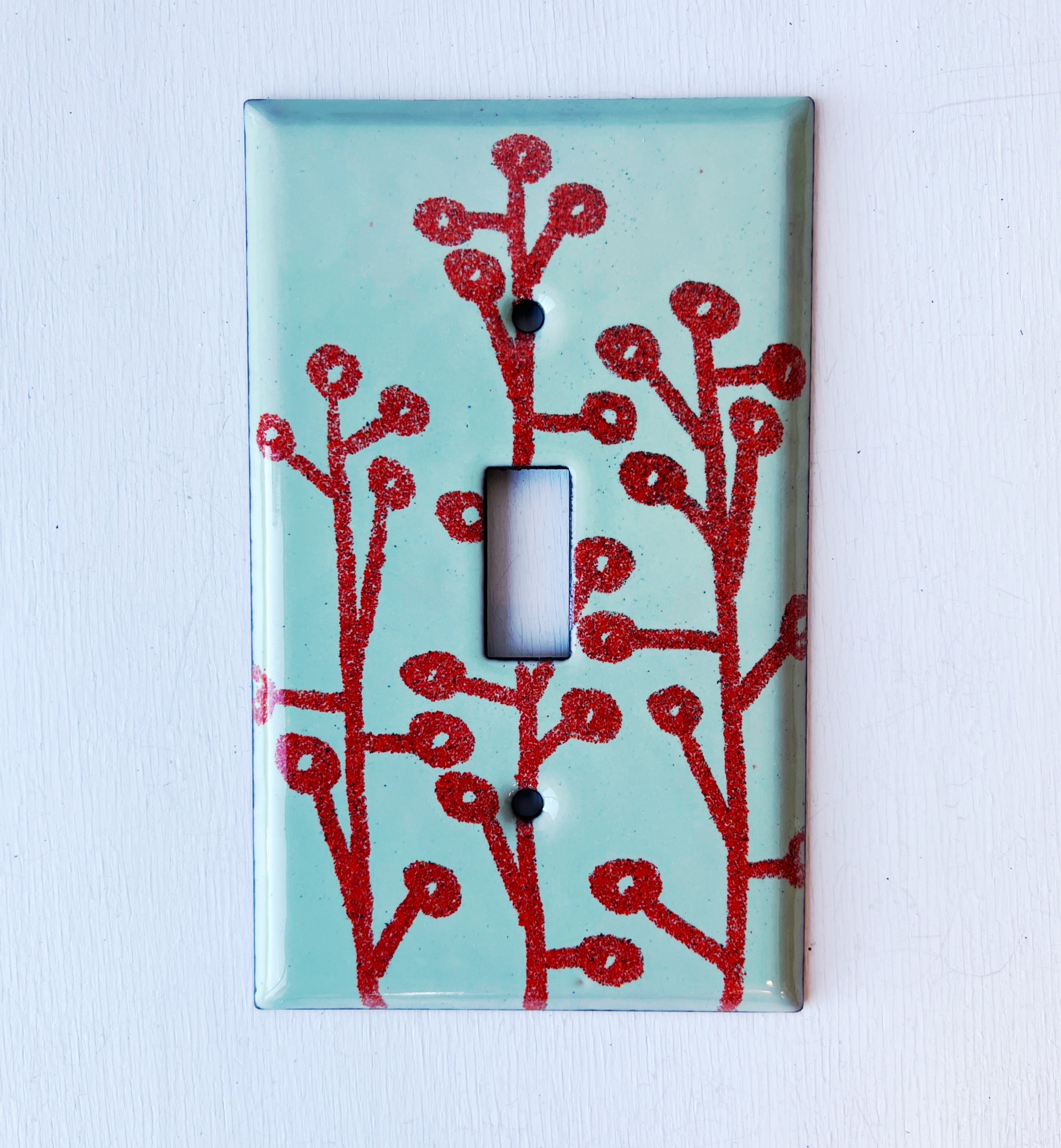 Each light switch plate is kiln fired twice and hand drawn. They are standard size, signed and dated on the back, and come with "copper" screws.
