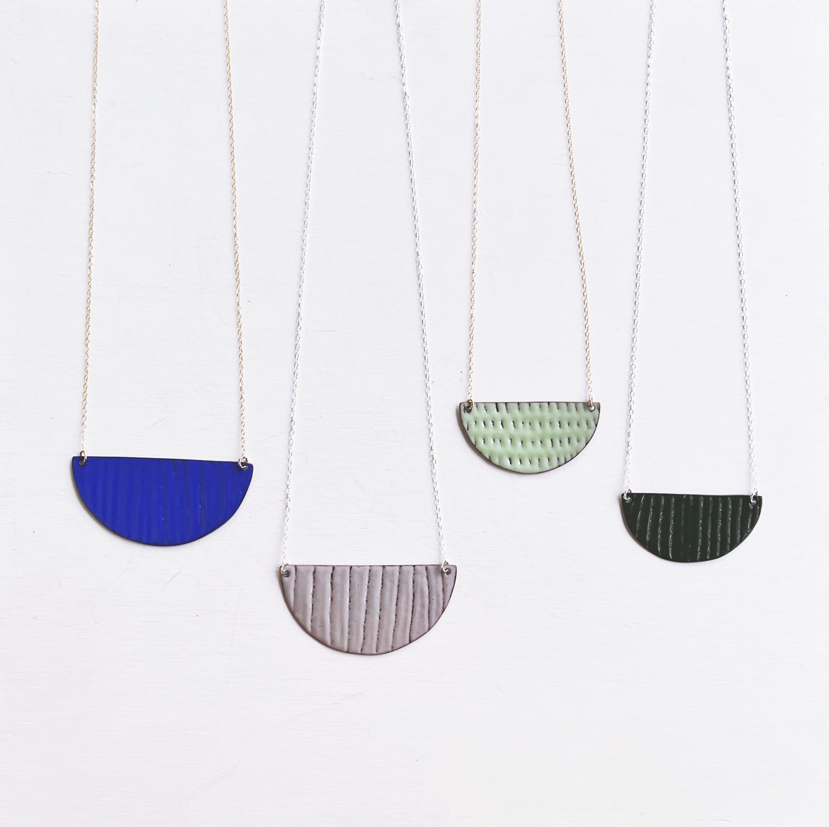 Hand cut copper sheet with lines on one side and dots on the other. I draw into the enamel before I fire it to create the textures/patterns.