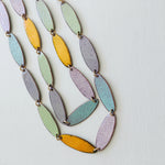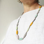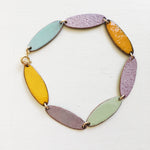 I was spontaneously inspired to make this one day in the studio. Especially the pastel color combination with the different textures made by under-firing or over-firing the enamel. It has taken me weeks to finish the set but I love it and hope you do, too.