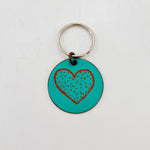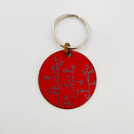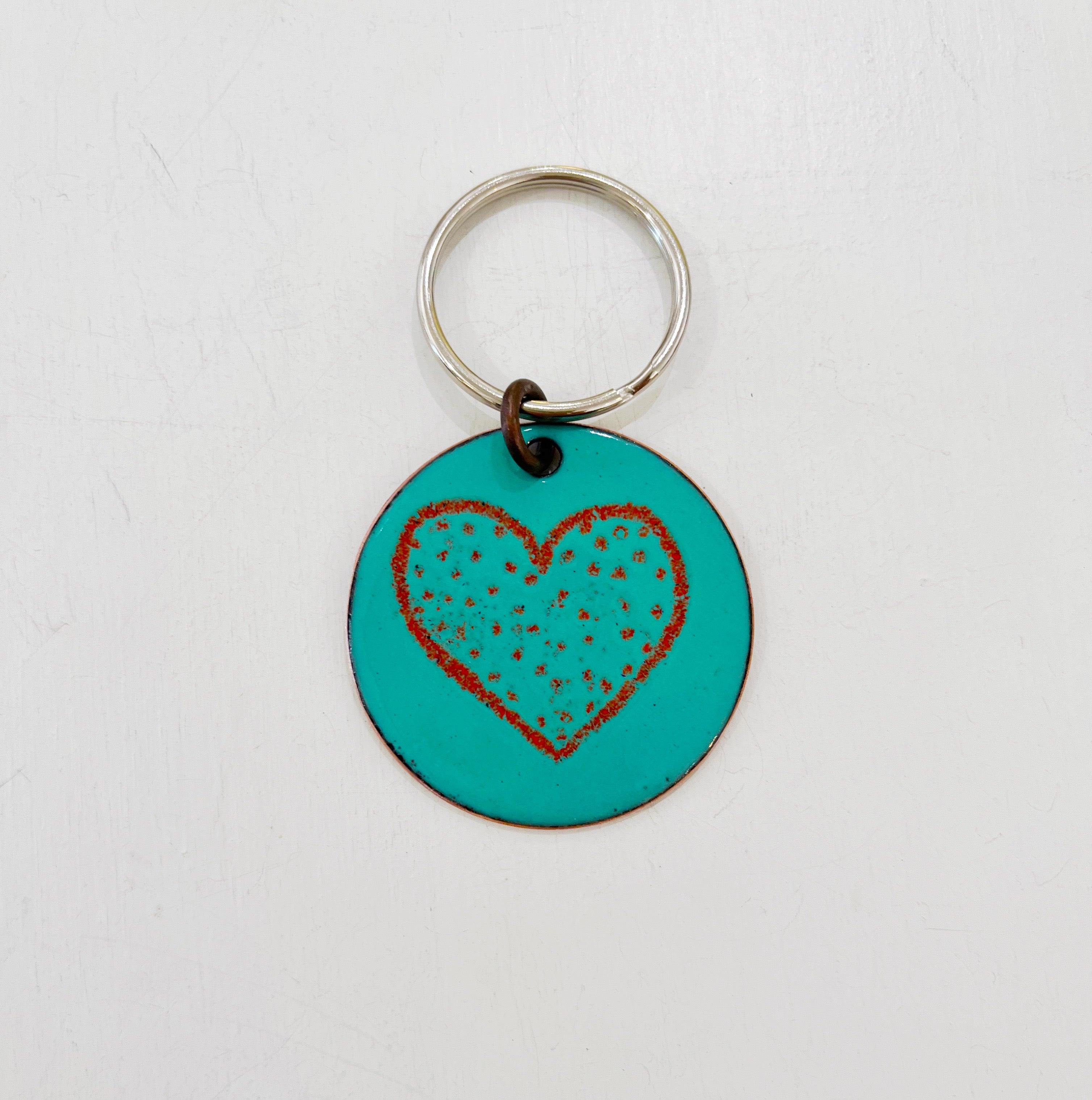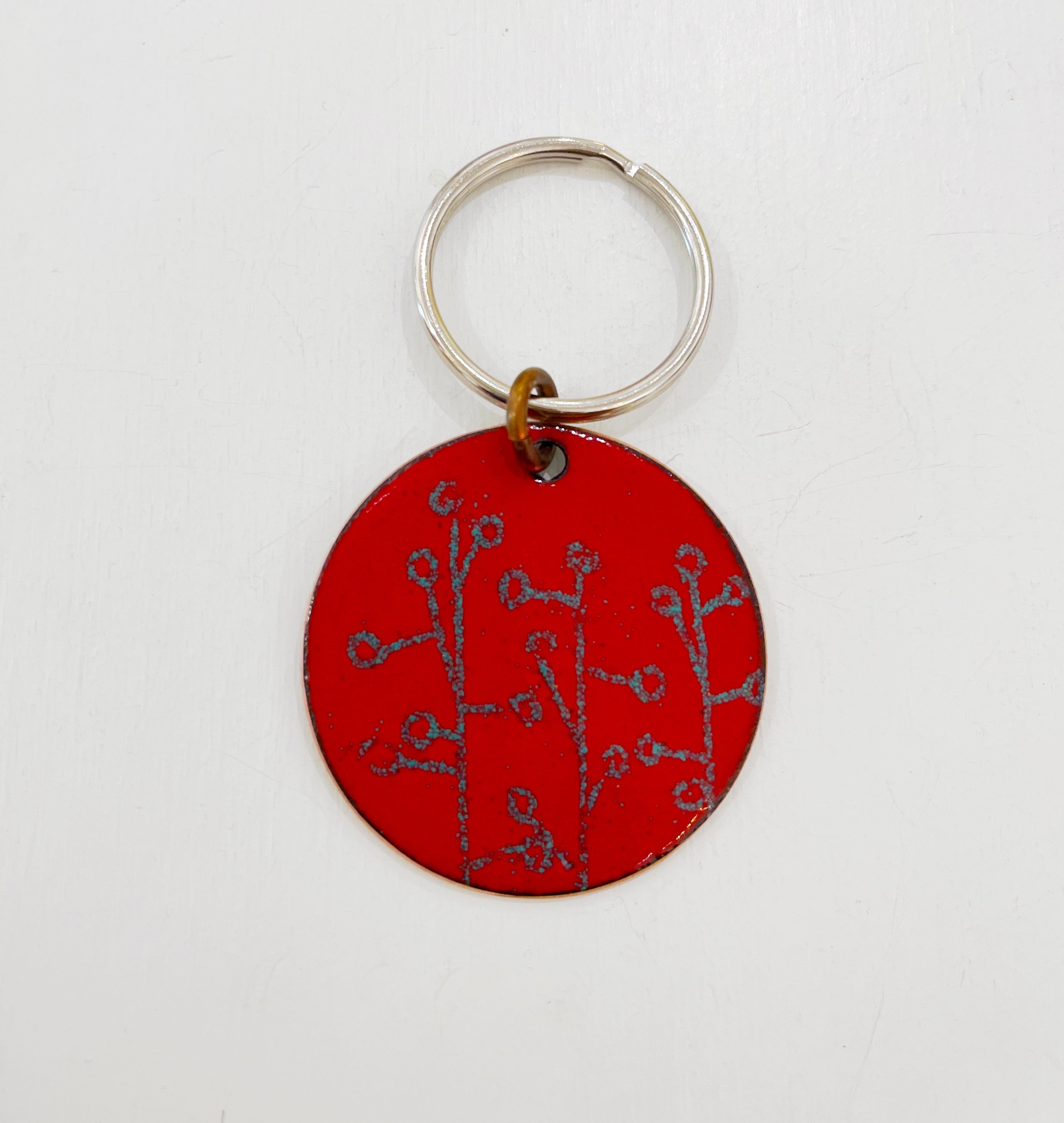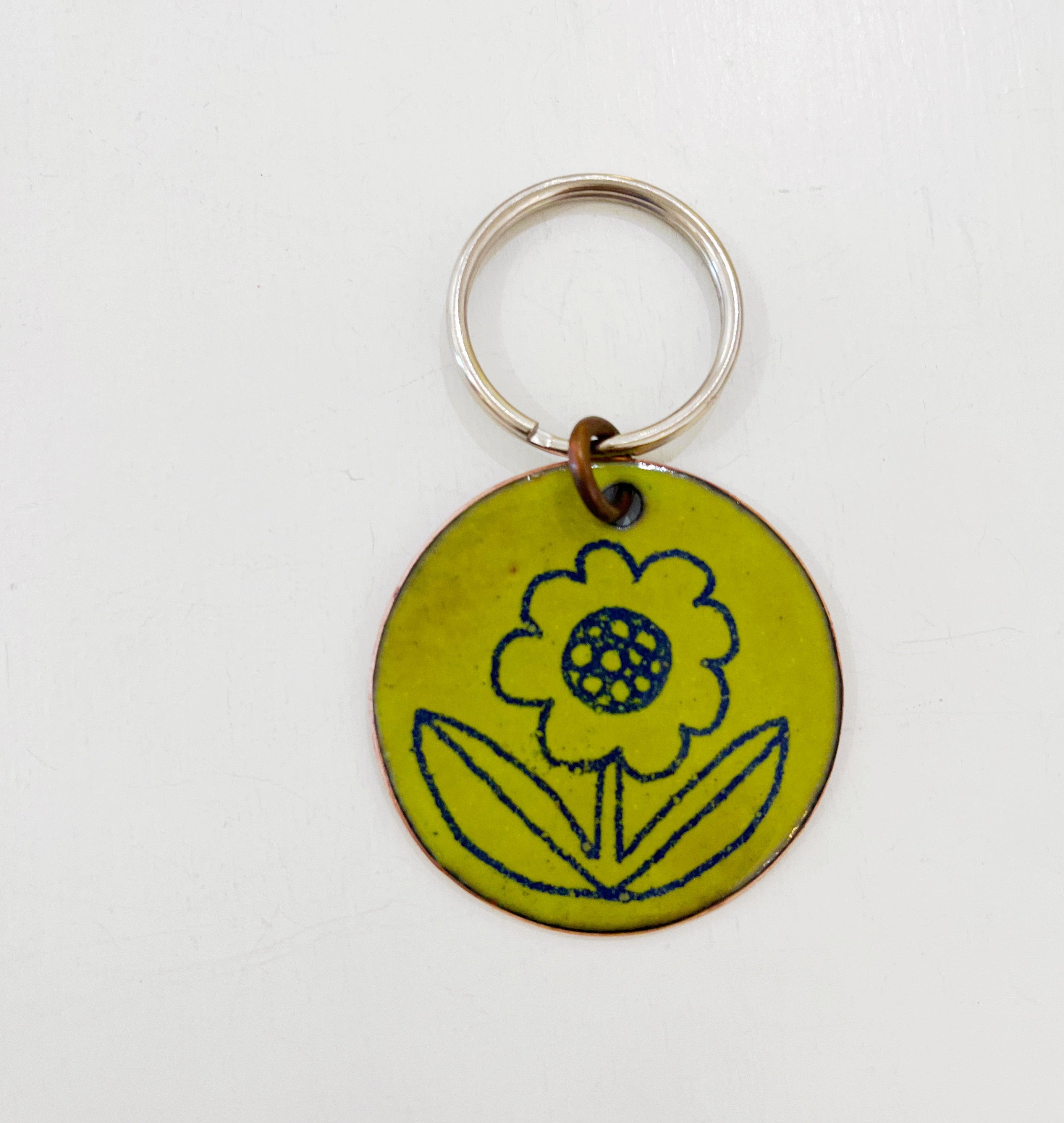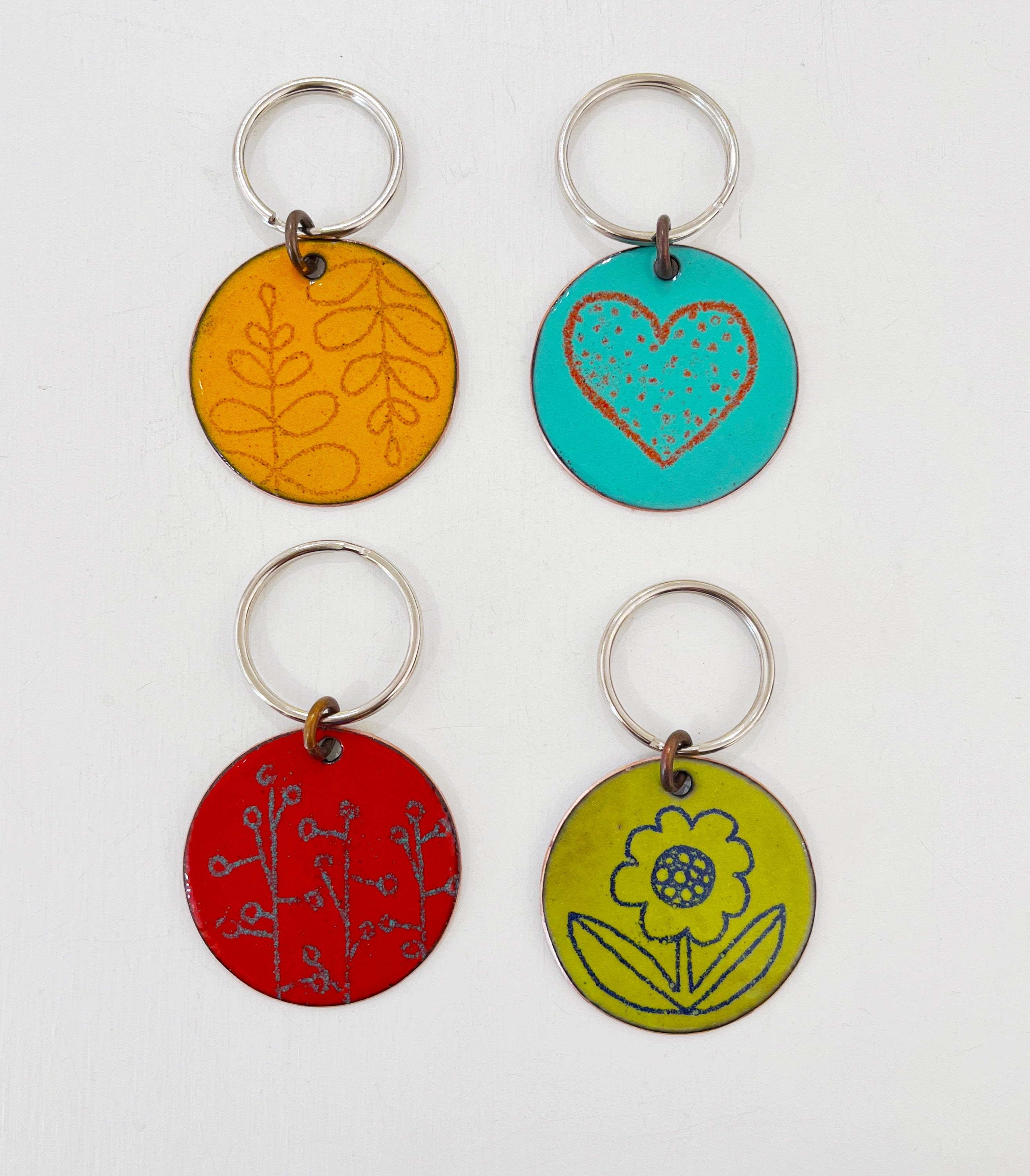 Kiln fired glass enamel on copper. I hand draw each one and fire it three times. The back is a different color. They come with sturdy brass jump rings and key rings.