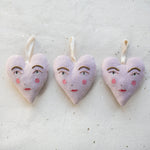 Each scented ornament is hand illustrated and embroidered using vibrant polyester threads on assorted linens. Each ornament is hand cut, turned, and stuffed with organic cotton and lavender. Natural twill tape is placed on top for hanging.